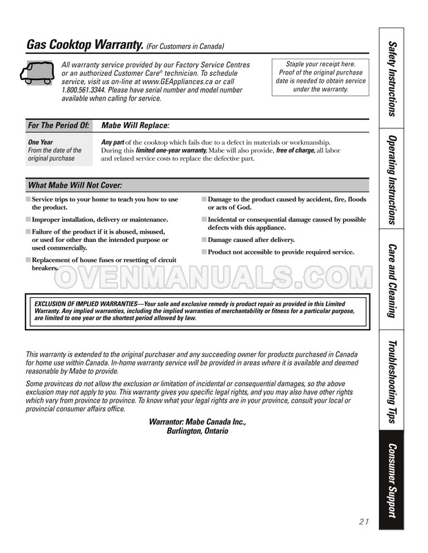 Learn about all the features, troubleshooting and maintenance of white integrated 30" gas cooktop. Cooking with the GE JGP328WEKWW hob will become incredibly easy and comfortable after reading the owner's manual in English.