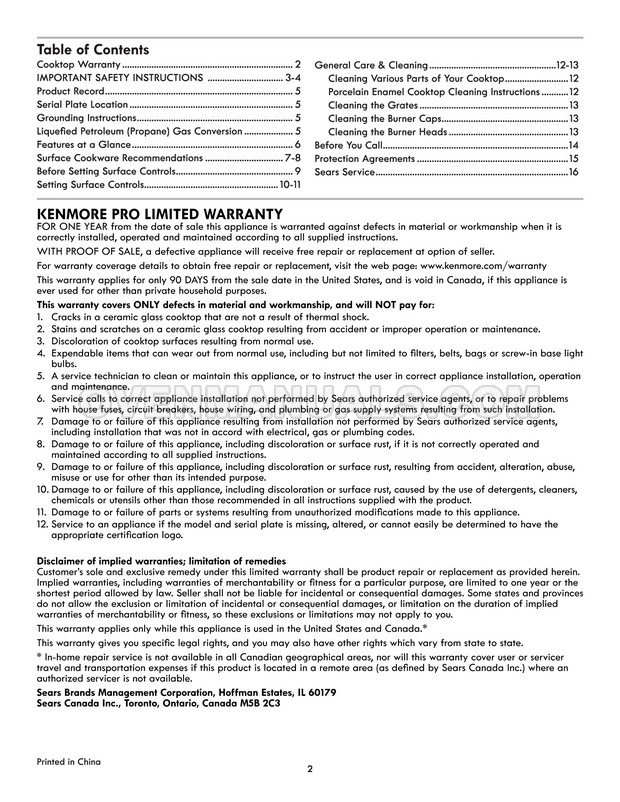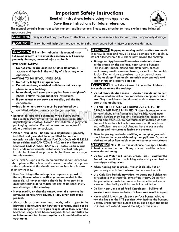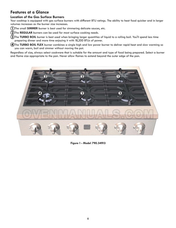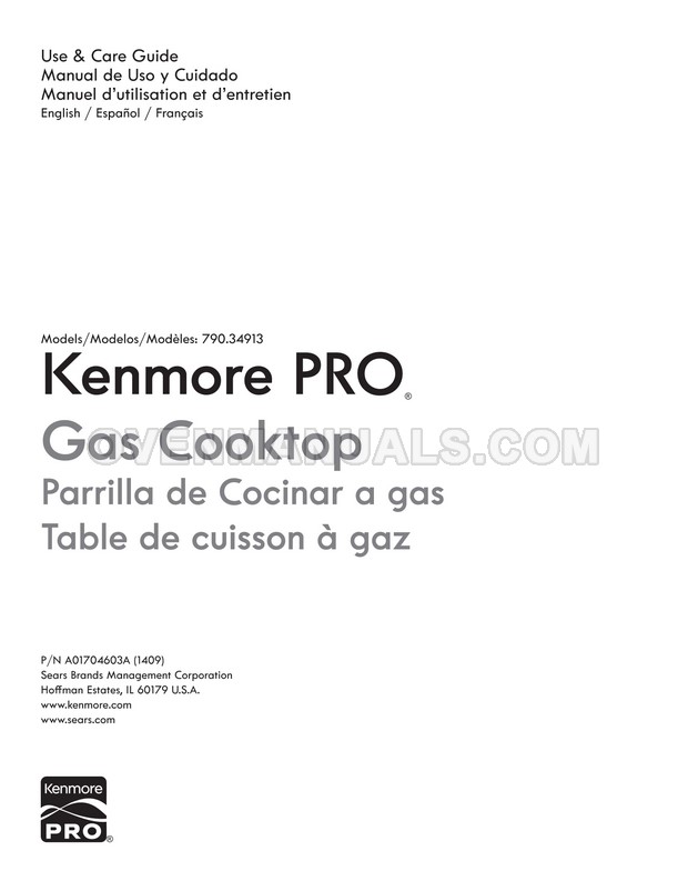 This document contains recommendations for the correct adjustment and use of a 6 burners 36" width slide-in gas cooktop. Read the use & care guide before you start cooking, so that you can use all the features of the Kenmore 790.34913 PRO hob.