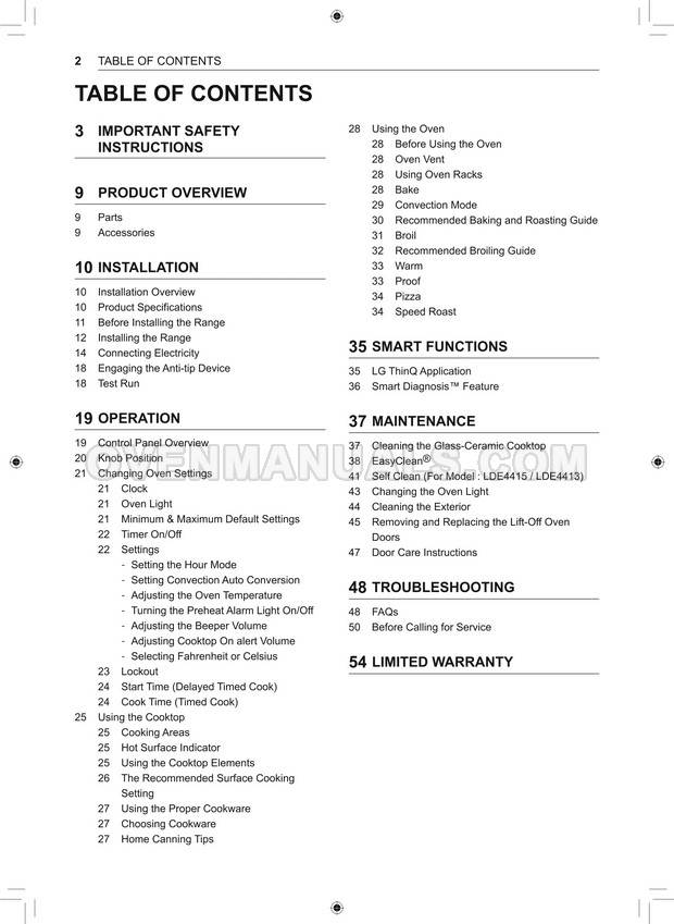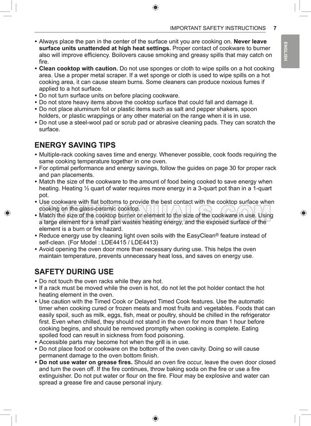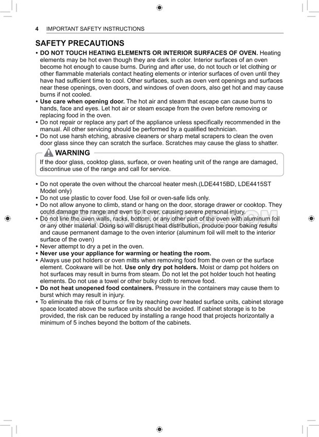 The owner's manual for 7.3 cu. ft. capacity electric double oven range with ProBake convection and EasyClean self-cleaning describes the operating modes, connection and maintenance requirements. Follow the manufacturer's recommendations and LG LDE4413ST range will remain great kitchen appliance for a long.