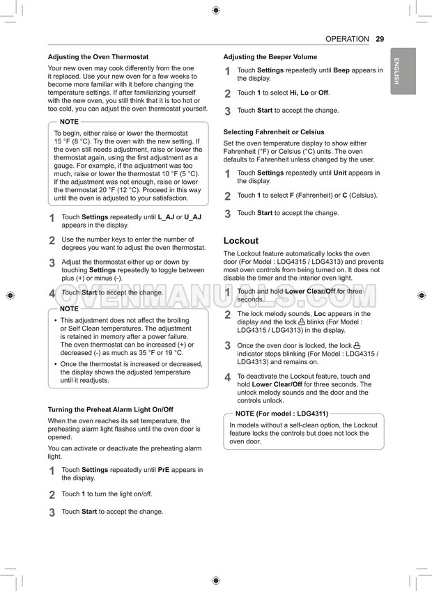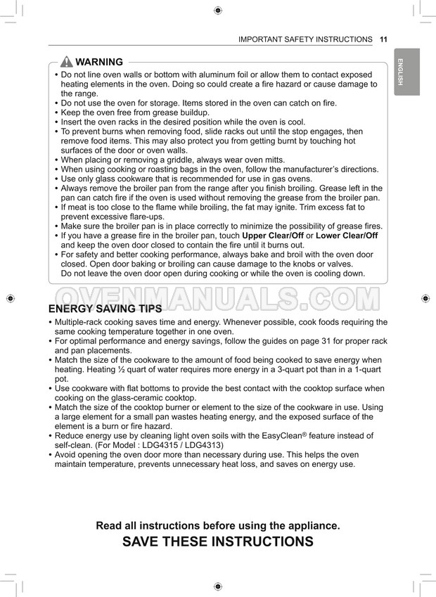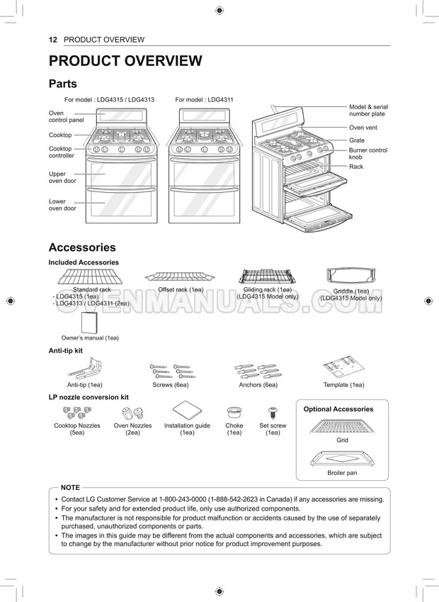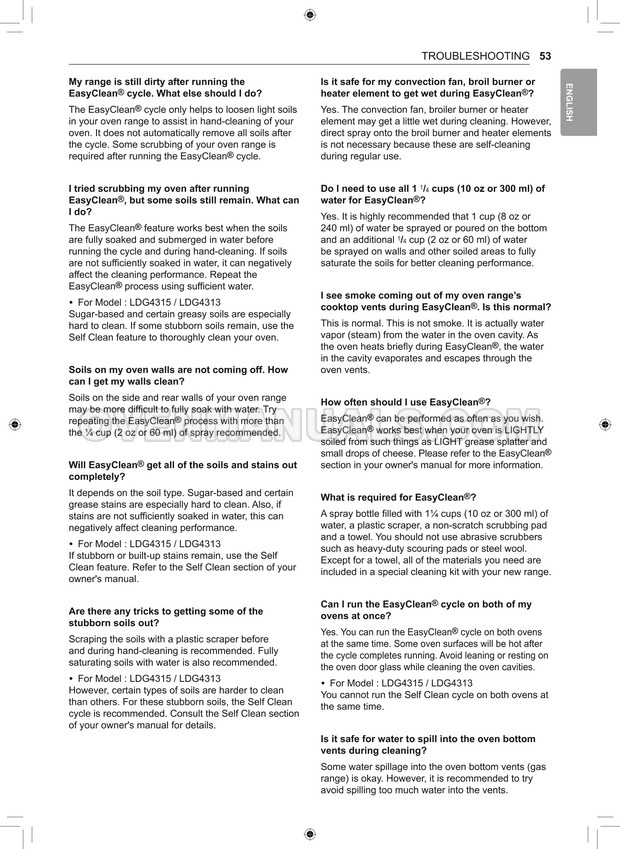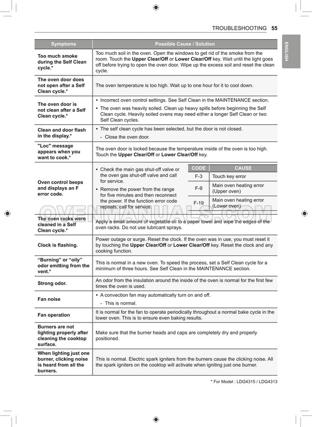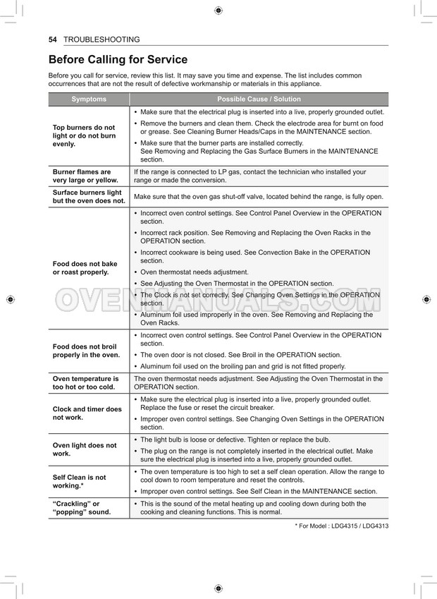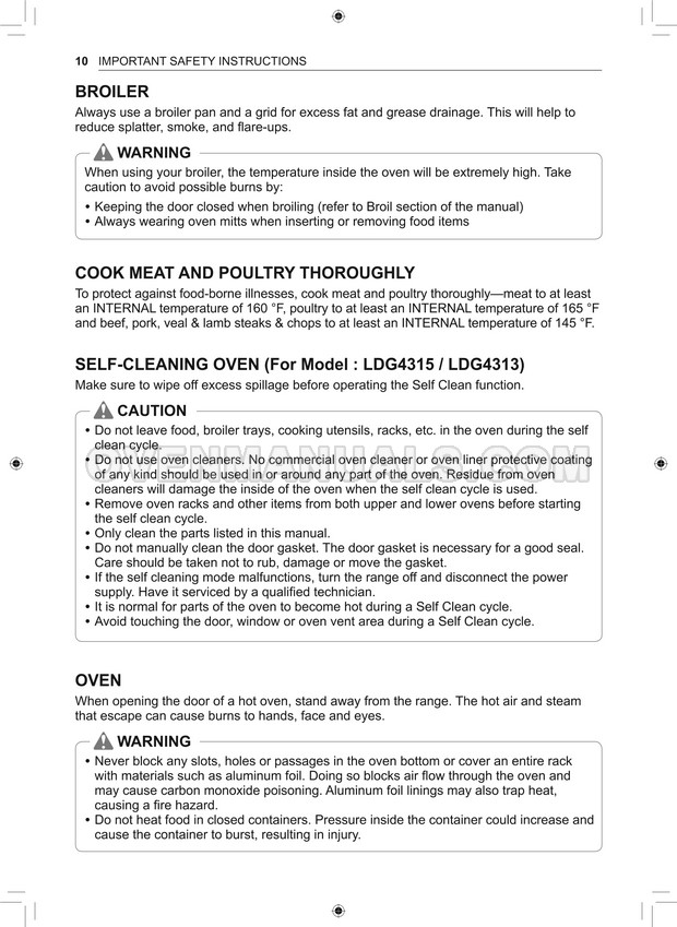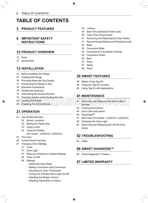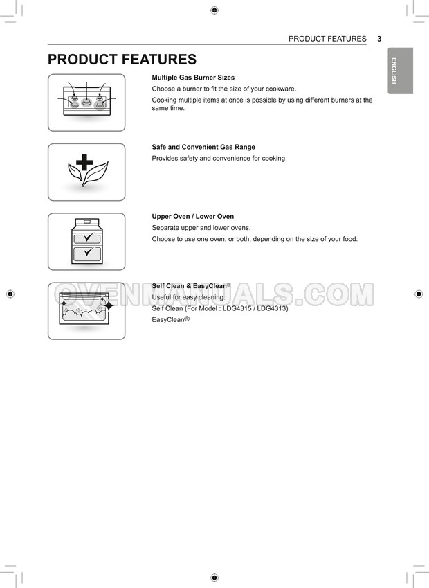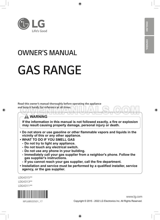 Use all the features of stainless steel 6.9 cu. ft. capacity ProBake Convection EasyClean double oven gas range with 5 burners. Read the owner's manual with recommendations from LG for cooking with the LDG4313ST range on 63 pages.