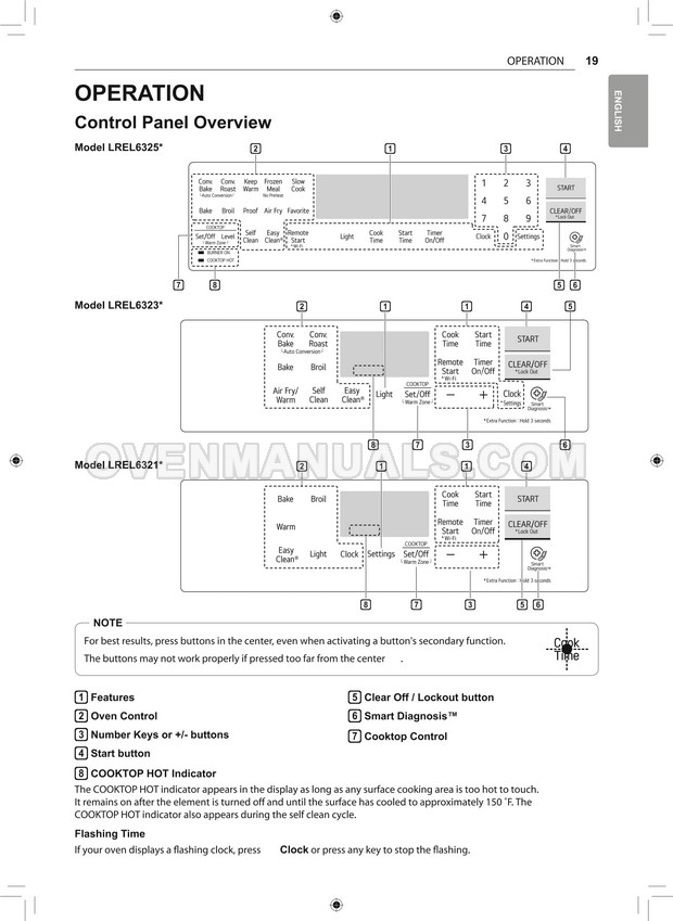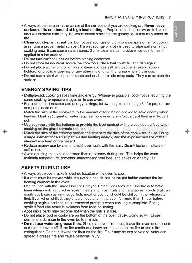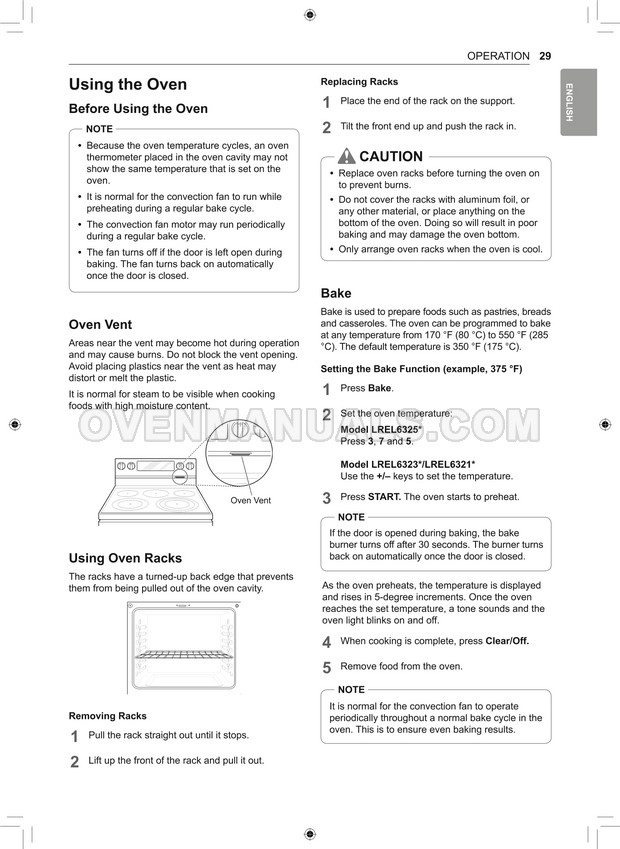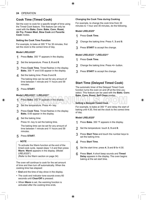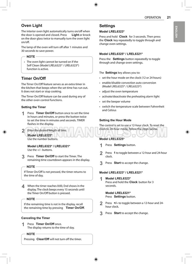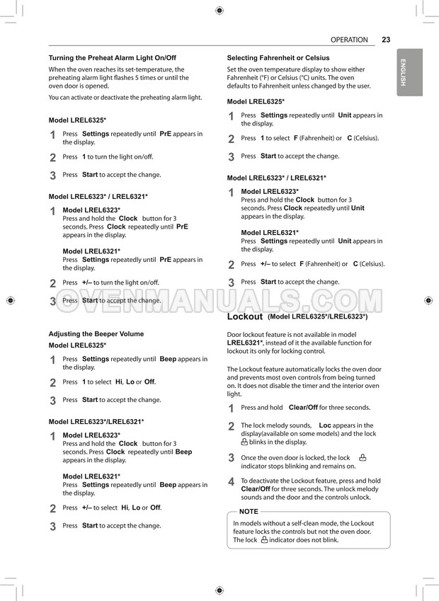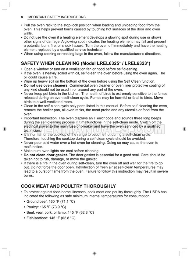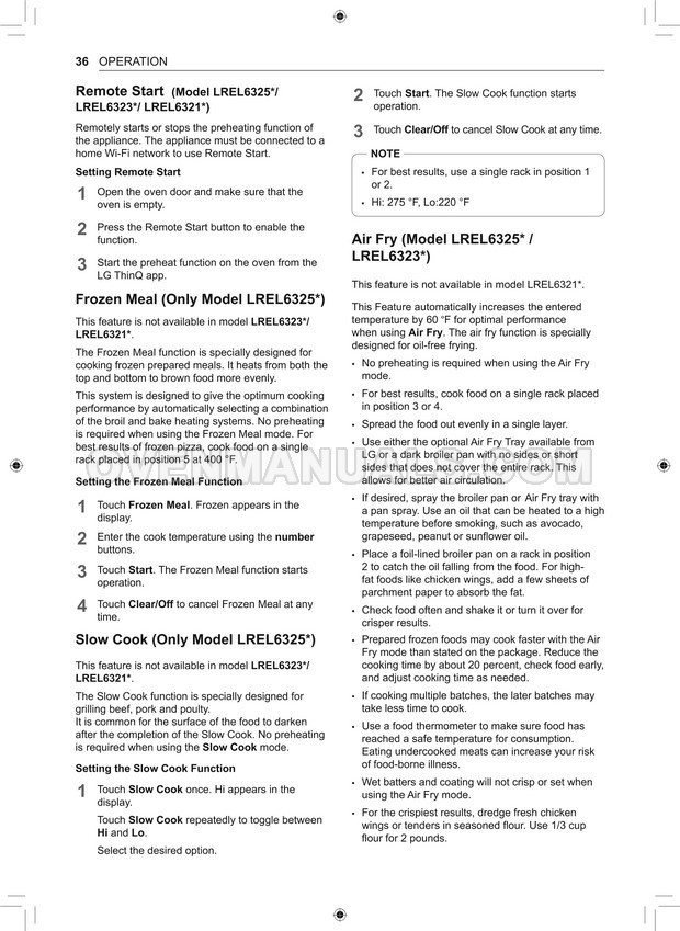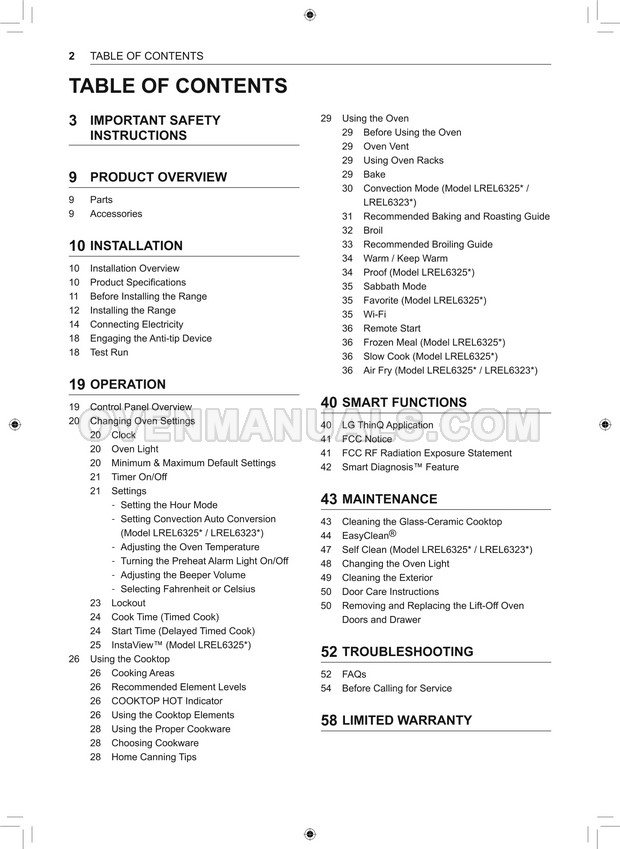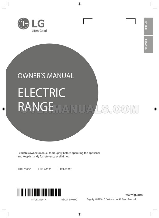 Read the manufacturer's recommendations for cooking with (LREL6321 models) 6.3 cu ft. EasyClean ThinQ Care Smart Wi-Fi electric range. This 64 page owner's manual describes all operating modes and features of the LG LREL6321S kitchen range.