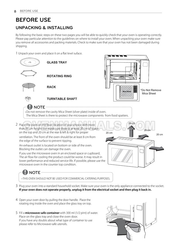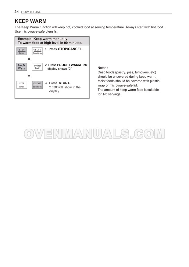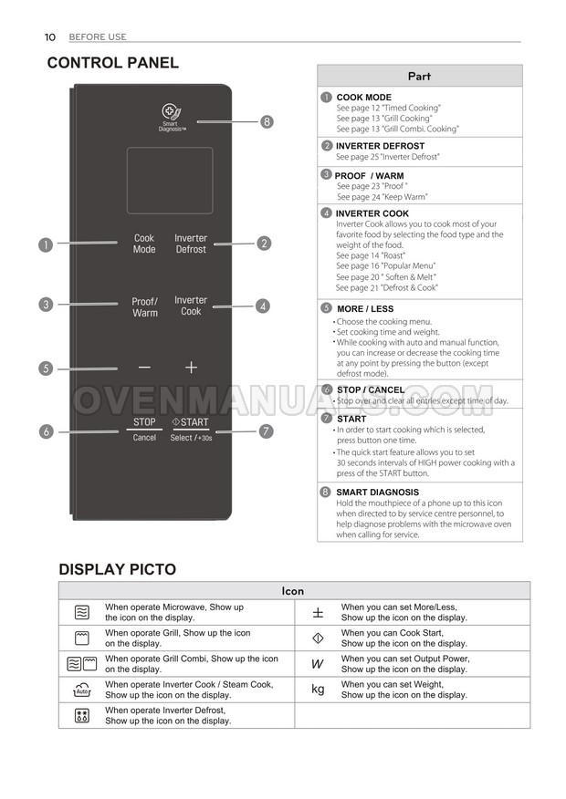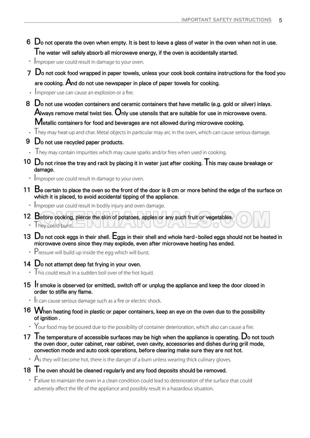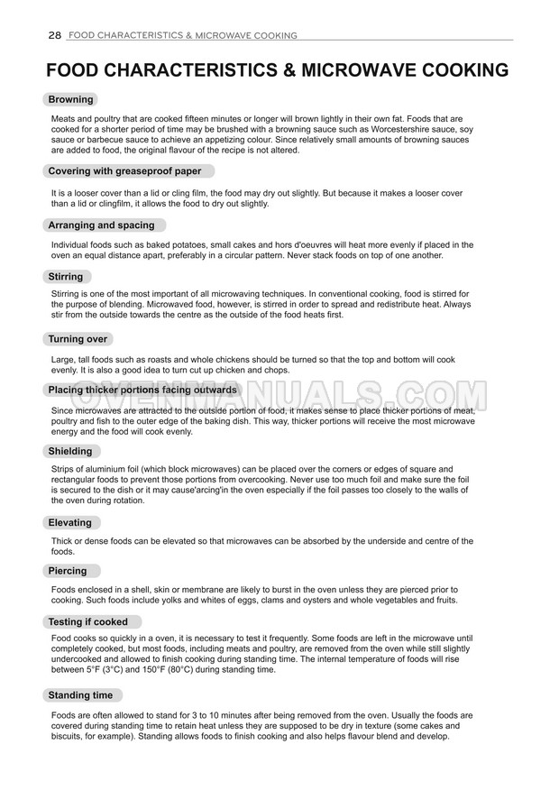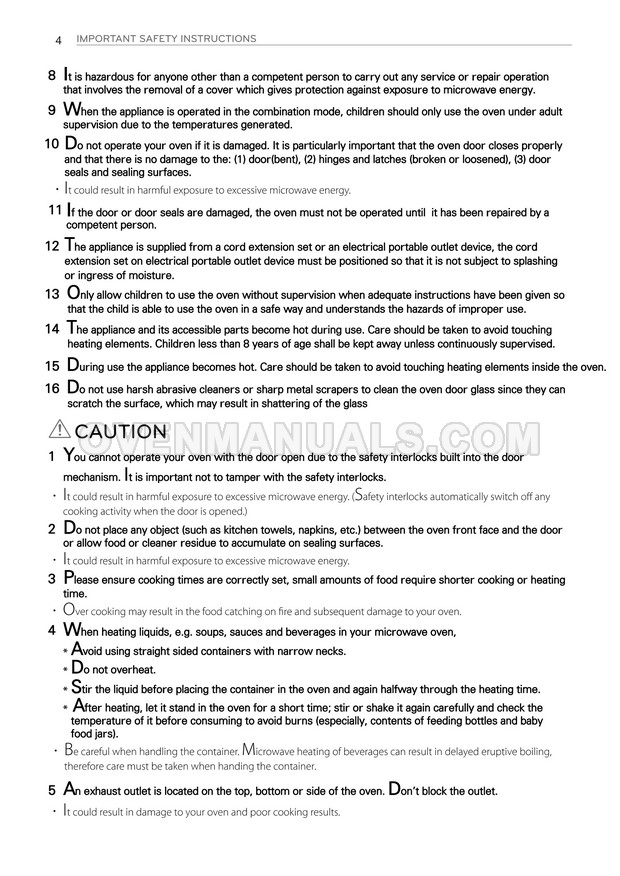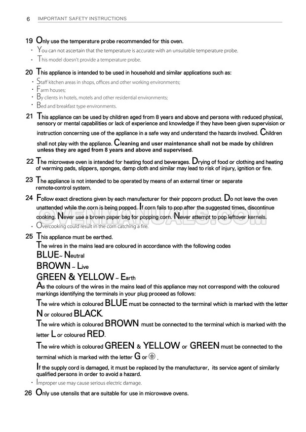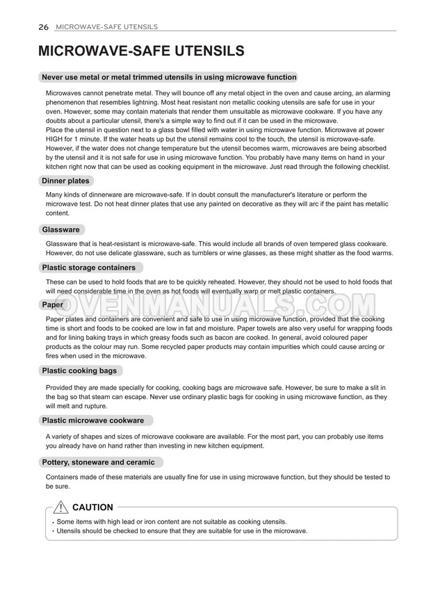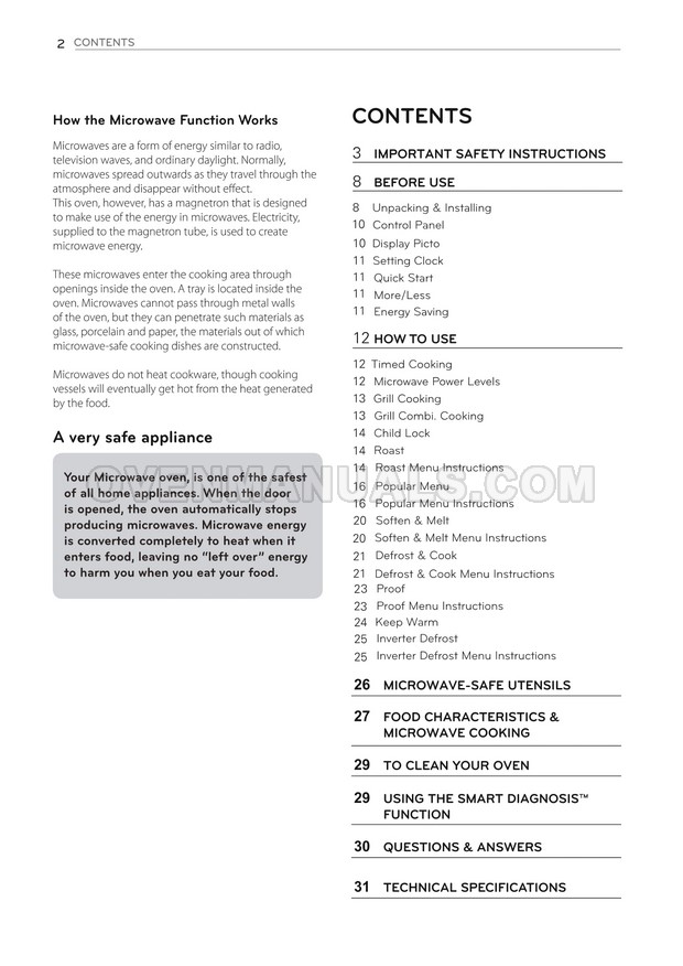 The LG MH7636GIS microwave oven is an essential kitchen tool and contains many features and operating modes for heating and cooking. The manufacturer describes recommendations for setting up and maintaining 36l NeoChef EasyClean Smart Inverter microwave oven on 32 pages of the owner's manual.