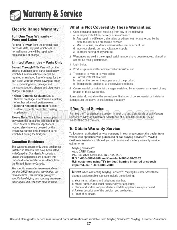 The use and care guide for 30 inch slide-in electric range with 4.5 cu.ft oven and Precision Touch Control 800 cooking system describes the operating modes, connection and maintenance requirements. Follow the manufacturer's recommendations and Maytag MES5875BCS range will remain great kitchen appliance for a long.
