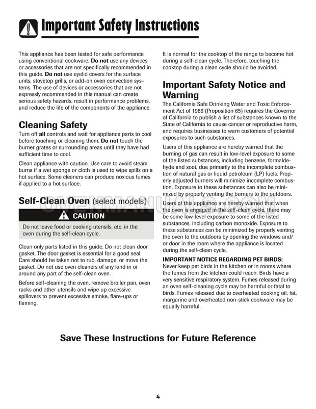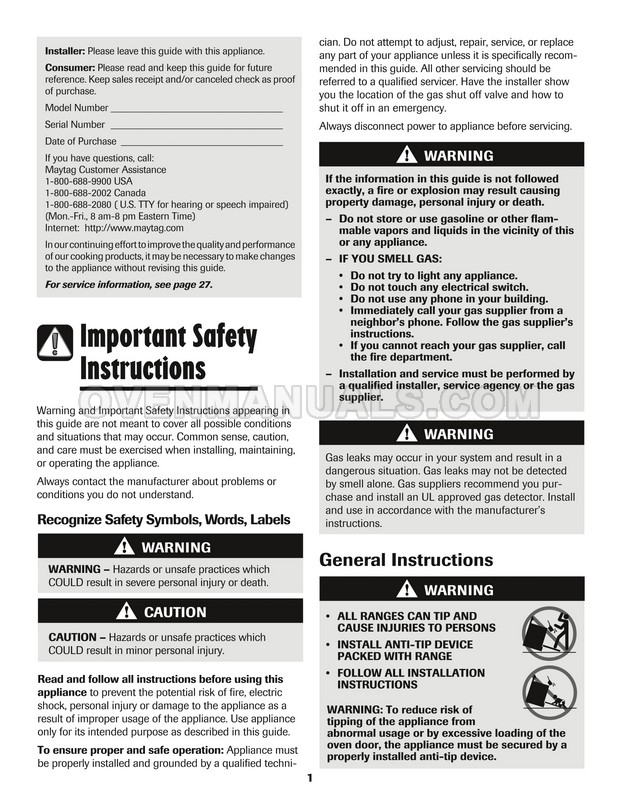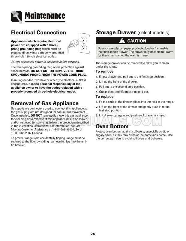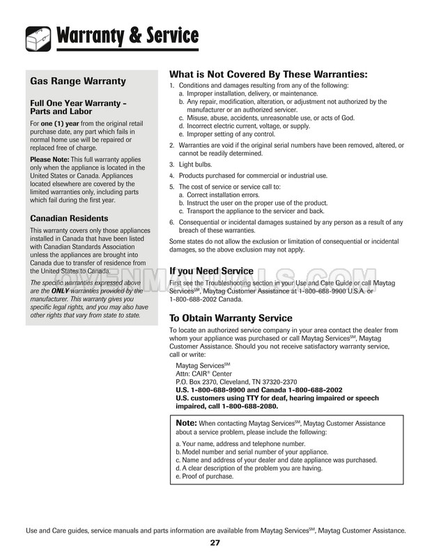 The use and care guide for freestanding 30" gas range with manual clean oven describes the operating modes, connection and maintenance requirements. Follow the manufacturer's recommendations and Maytag MGRH752BDW Performa range will remain great kitchen appliance for a long.