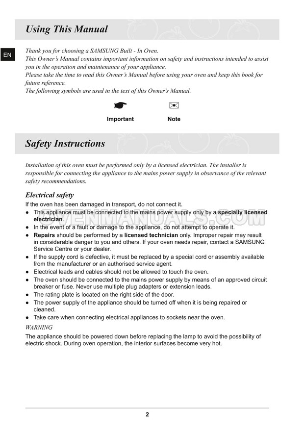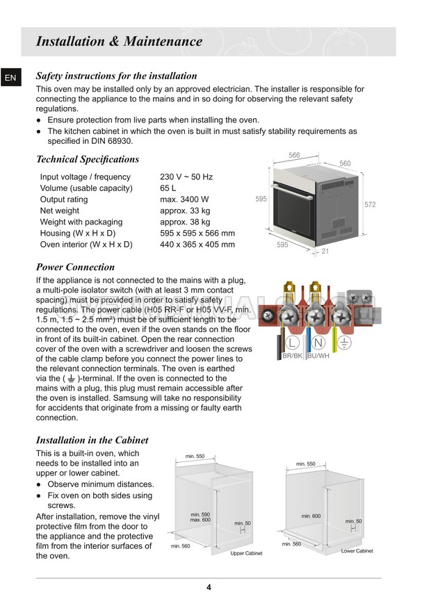 The Samsung BF641FB METRO-2Fan oven is an essential part of any kitchen. For proper use, read the user manual in English, which contains all the necessary information for the operation and maintenance of a 65 l dual fan (Twin Fan) electric oven hood with convection and grill.