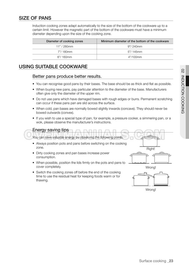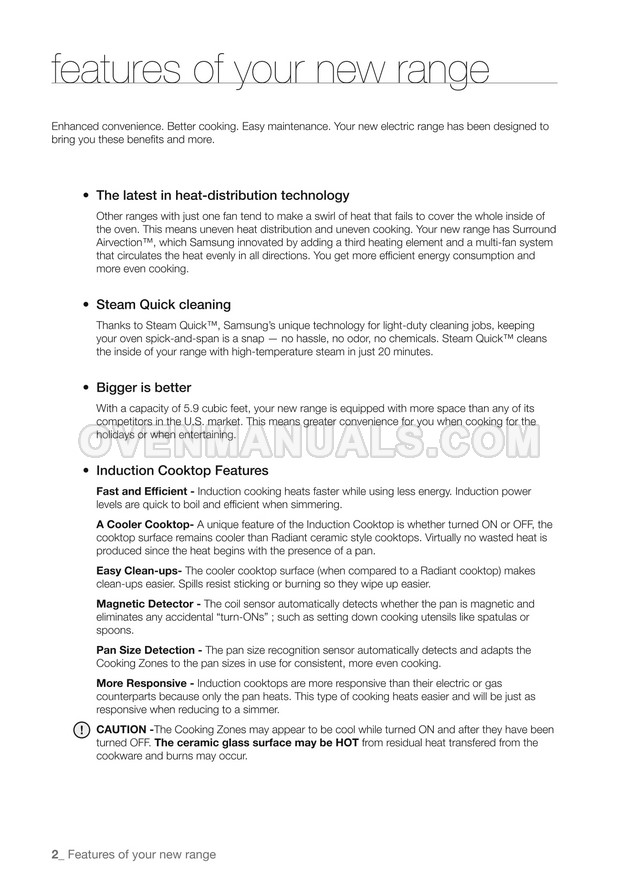 Use all the features of 30 inch freestanding induction range, 4 cooktop elements, convection, self clean. Read the user manual with recommendations from Samsung for cooking with the FTQ307NWGX range on 66 pages.