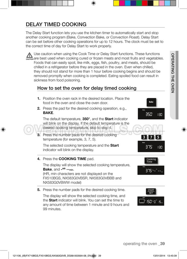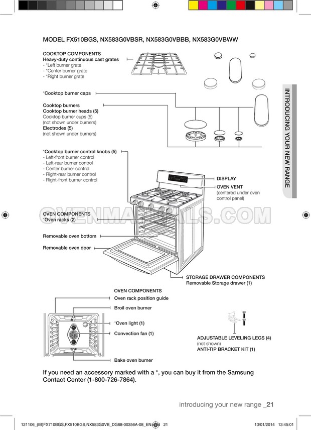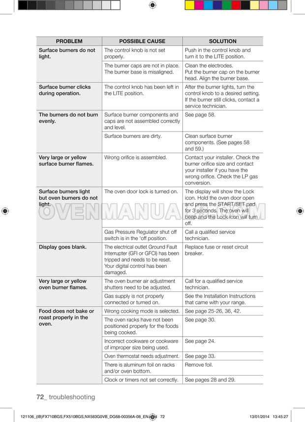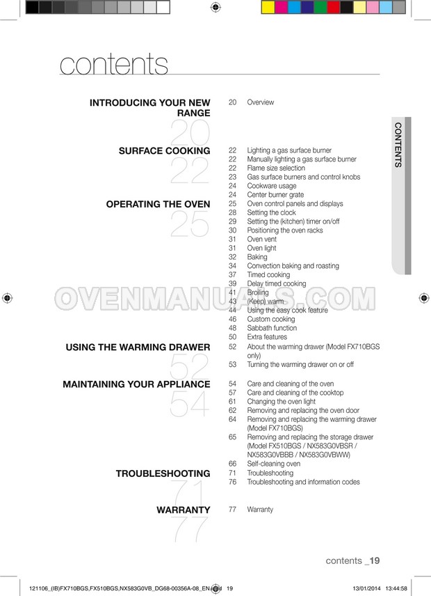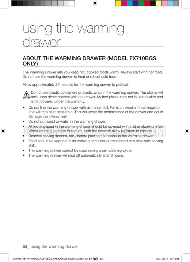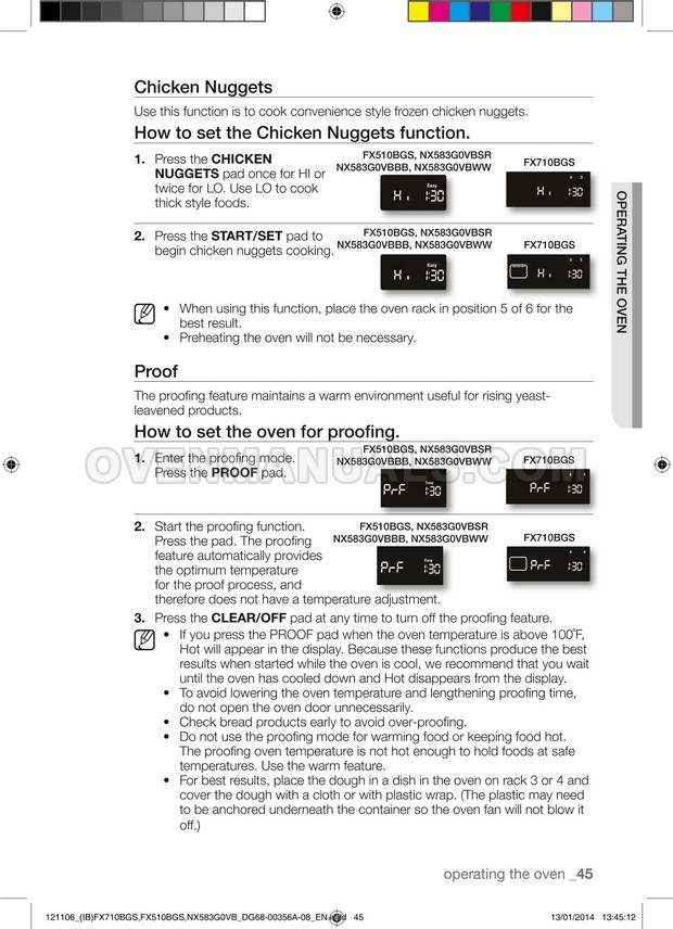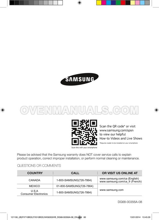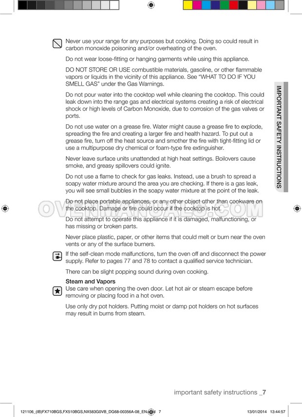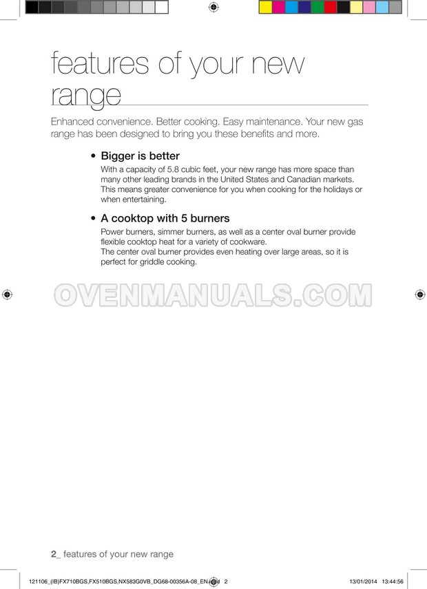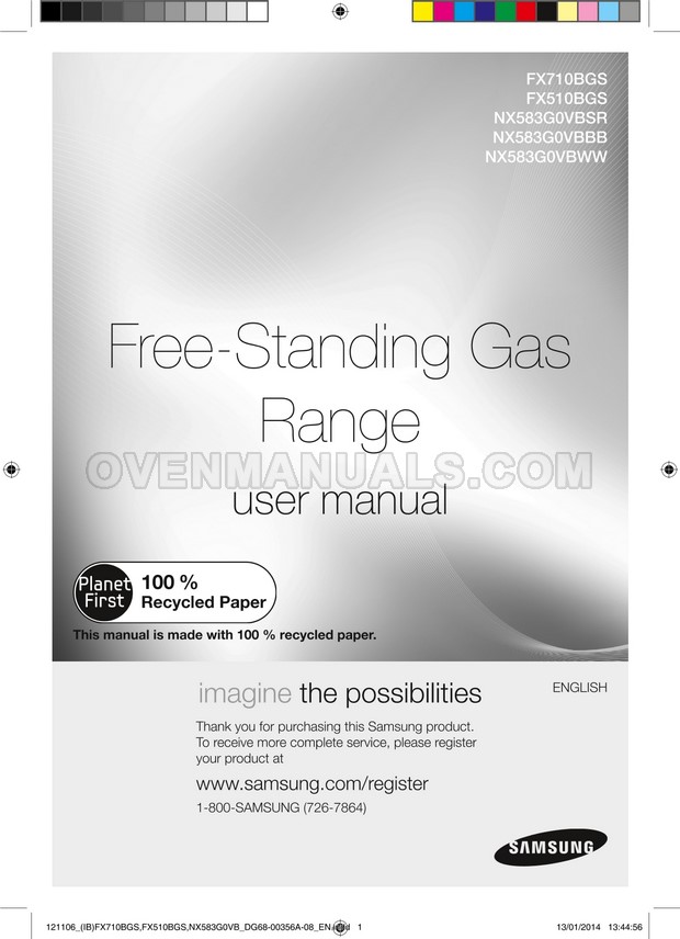 Read the manufacturer's recommendations for cooking with 30 inch freestanding gas range with 5 sealed burners, 5.8 cu.ft. gas convection oven, self-clean, 4 preset menu options, proofing and storage drawer. This 80 page user manual describes all operating modes and features of the Samsung FX510BGS kitchen range.