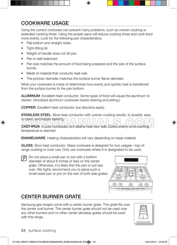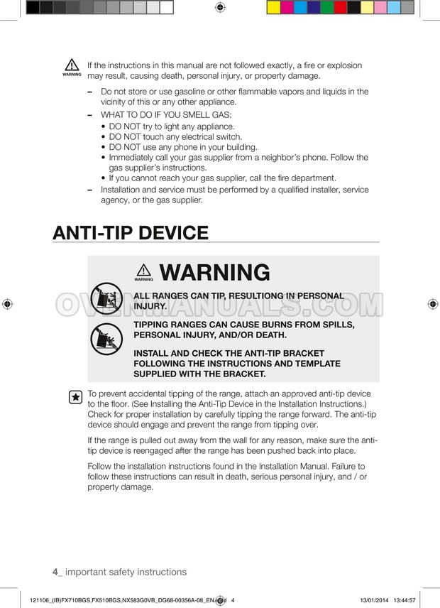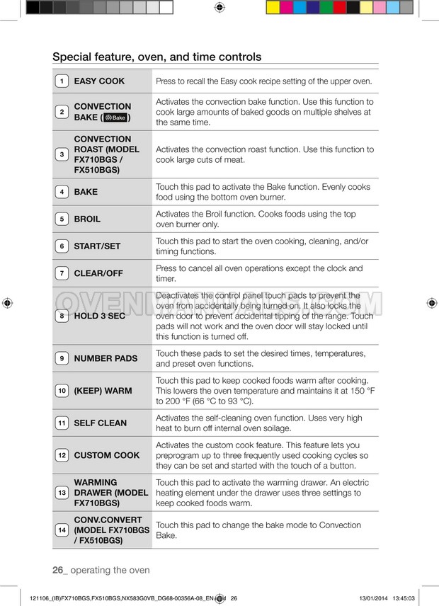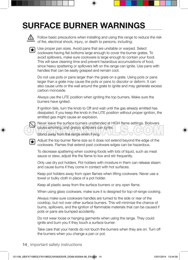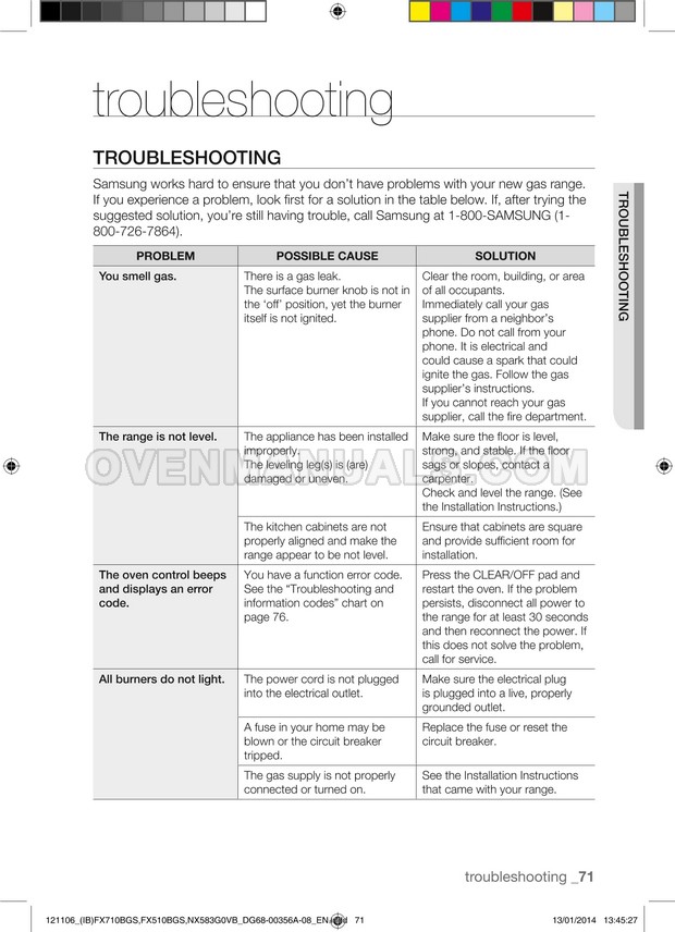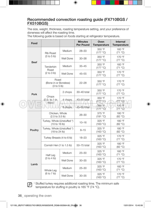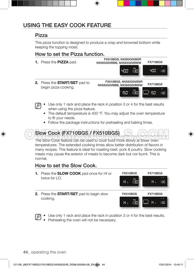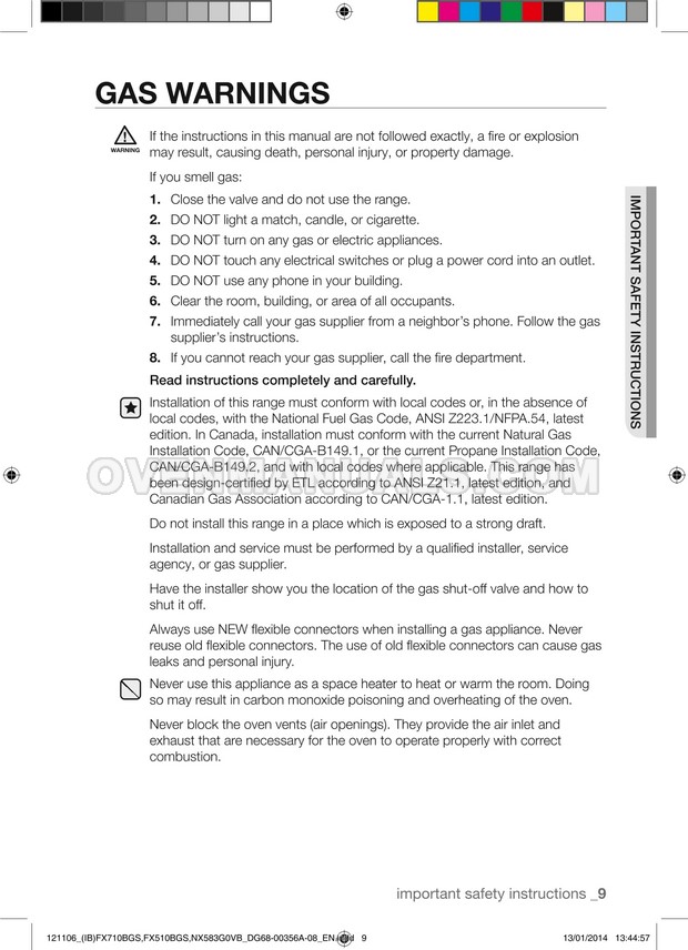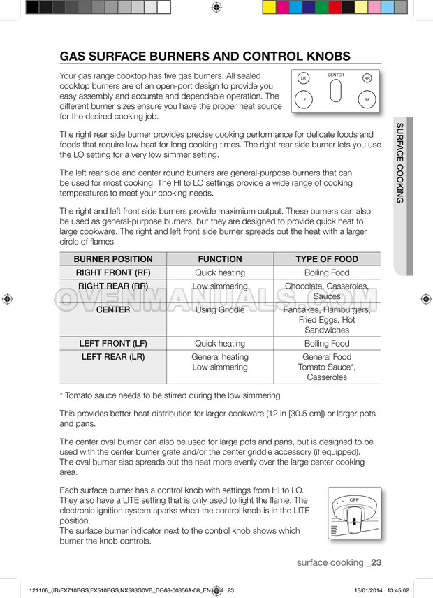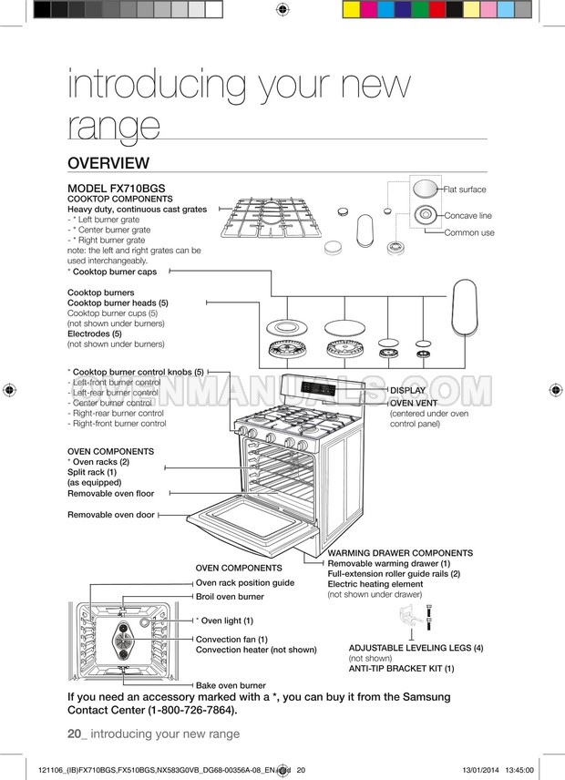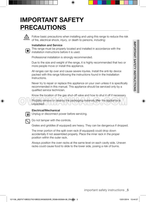 Read the manufacturer's recommendations for cooking with 30 inch freestanding gas range with 5 sealed burners, 5.8 cu.ft. gas convection oven, self-clean, 4 preset menu options, proofing and storage drawer. This 80 page user manual describes all operating modes and features of the Samsung FX510BGS kitchen range.