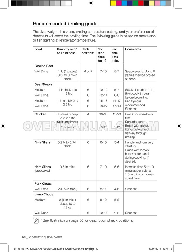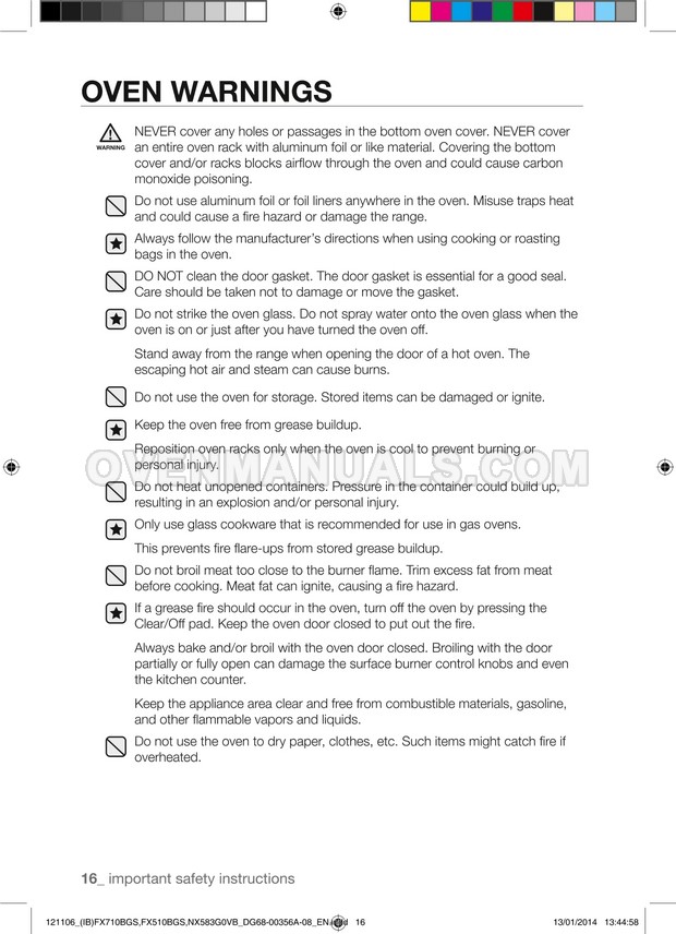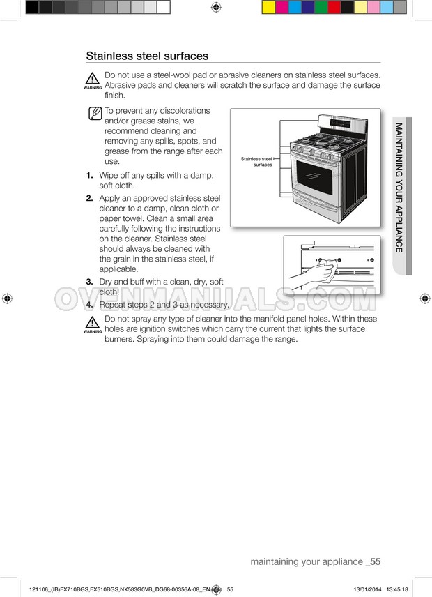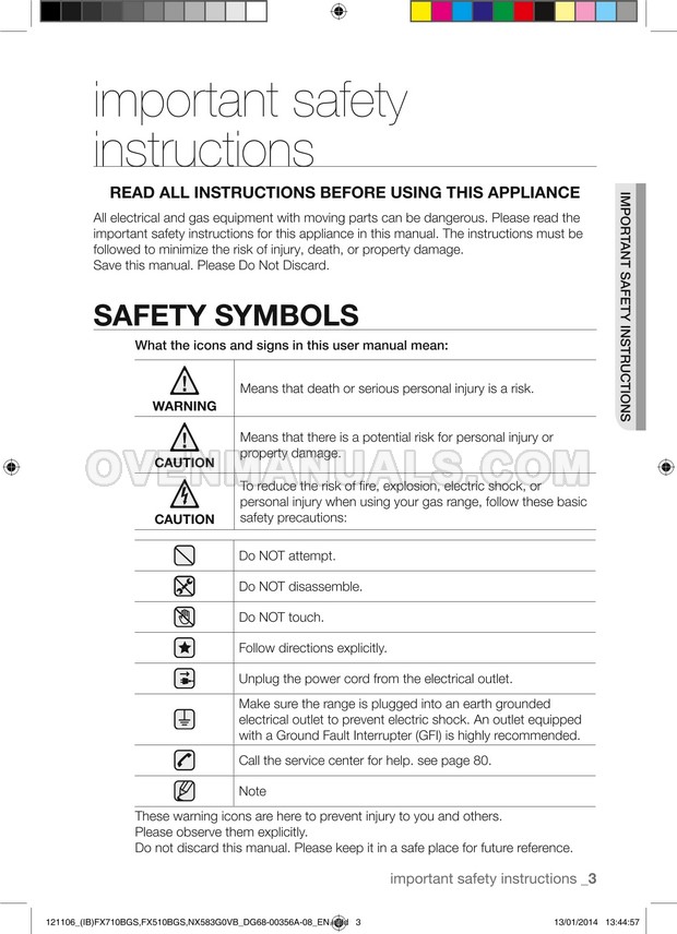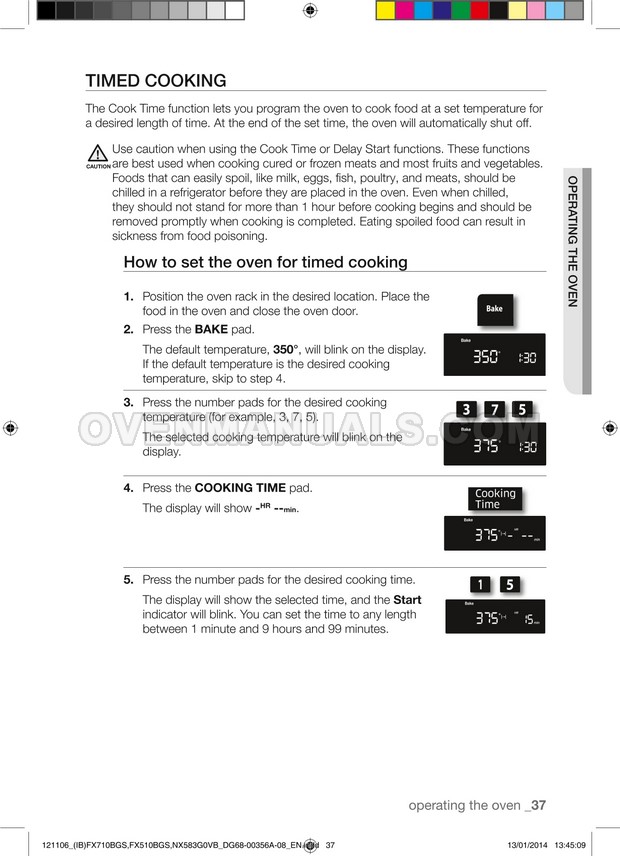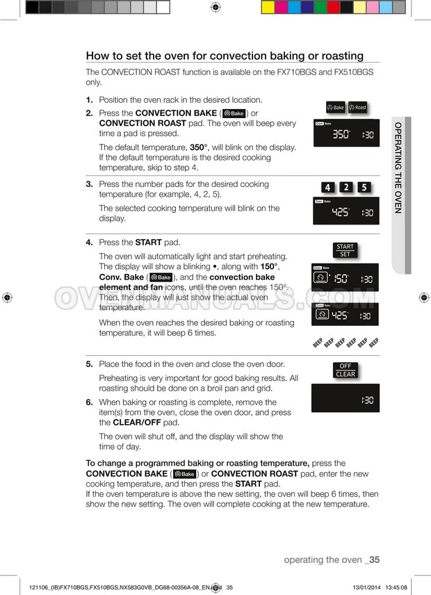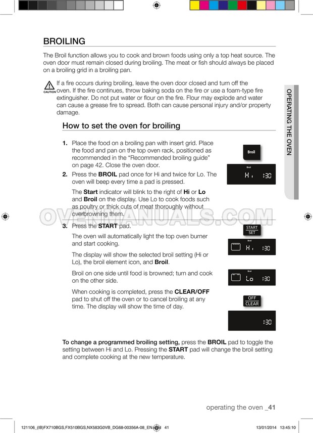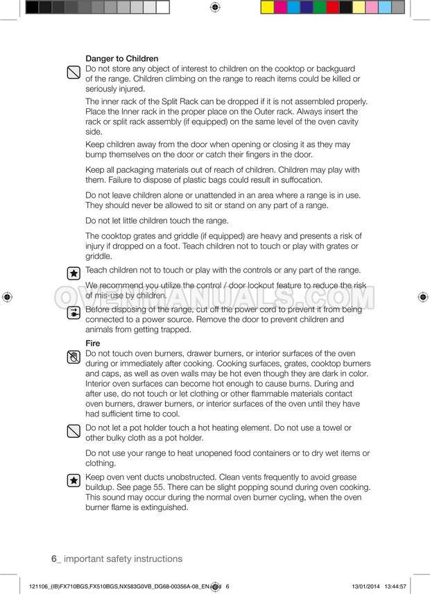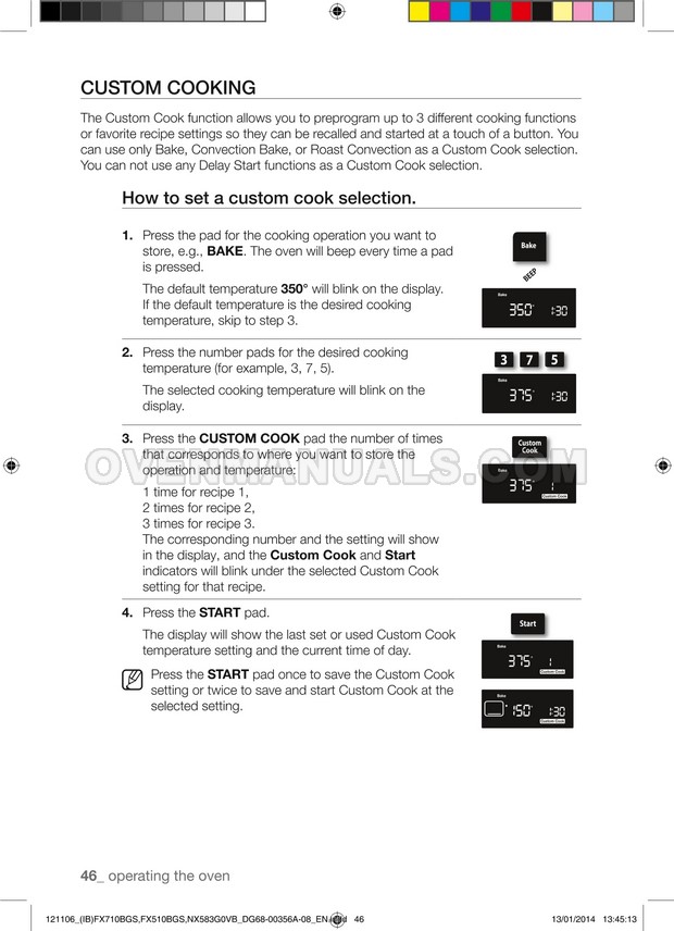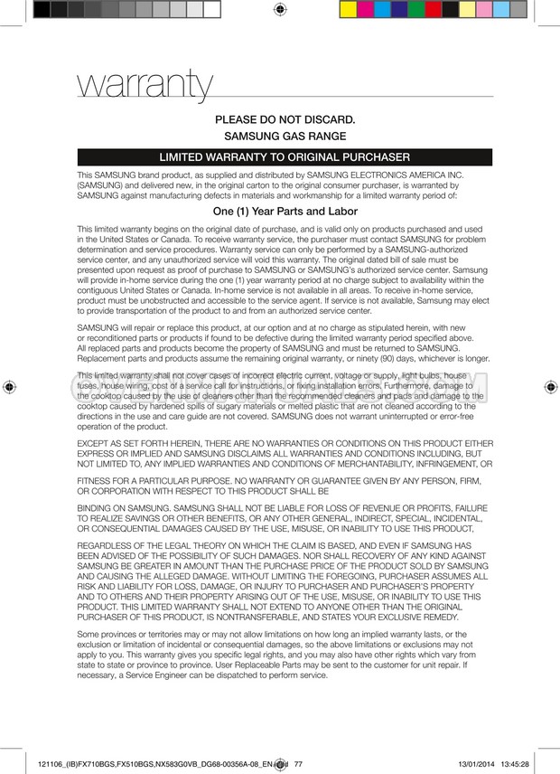 Read the manufacturer's recommendations for cooking with 30 inch freestanding gas range with 5 sealed burners, 5.8 cu.ft. gas convection oven, self-clean, 4 preset menu options, proofing and storage drawer. This 80 page user manual describes all operating modes and features of the Samsung FX510BGS kitchen range.