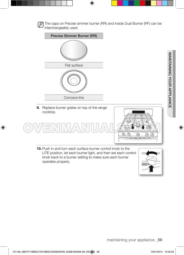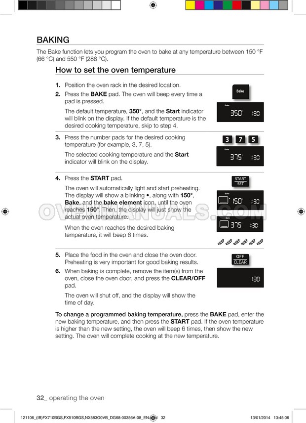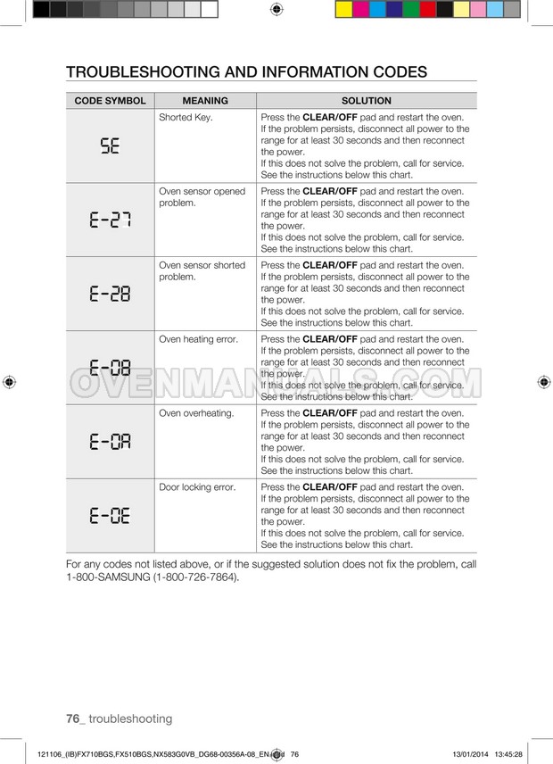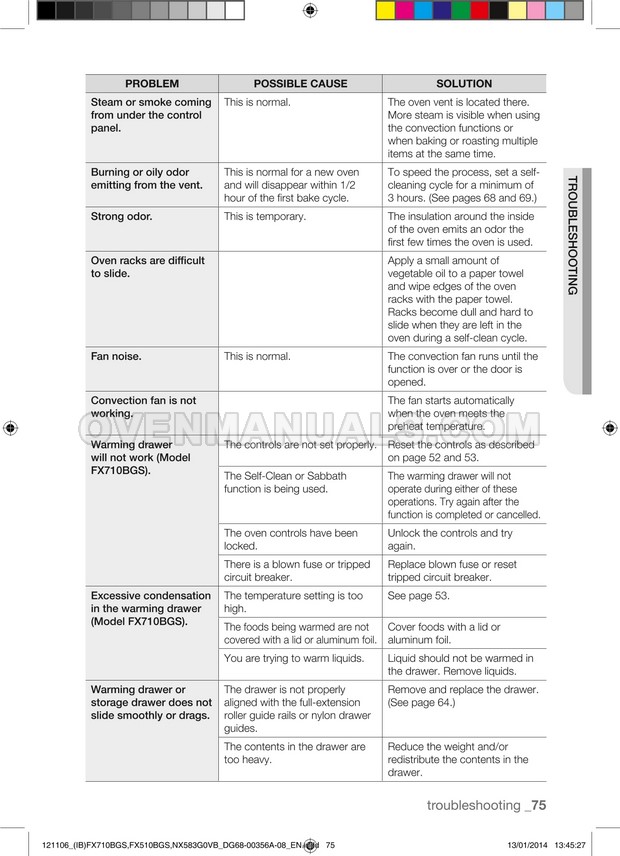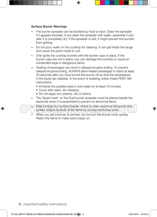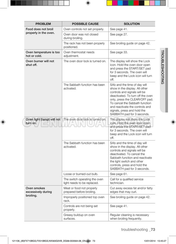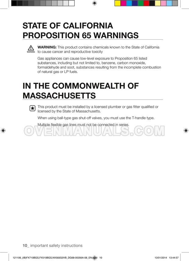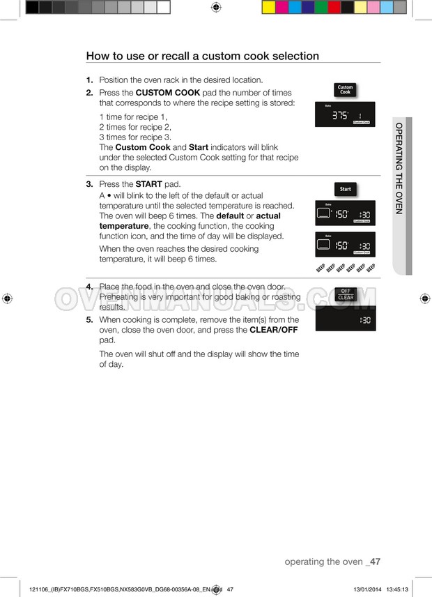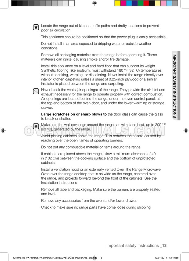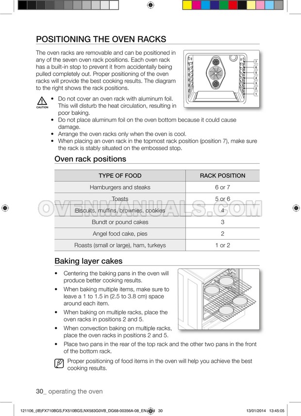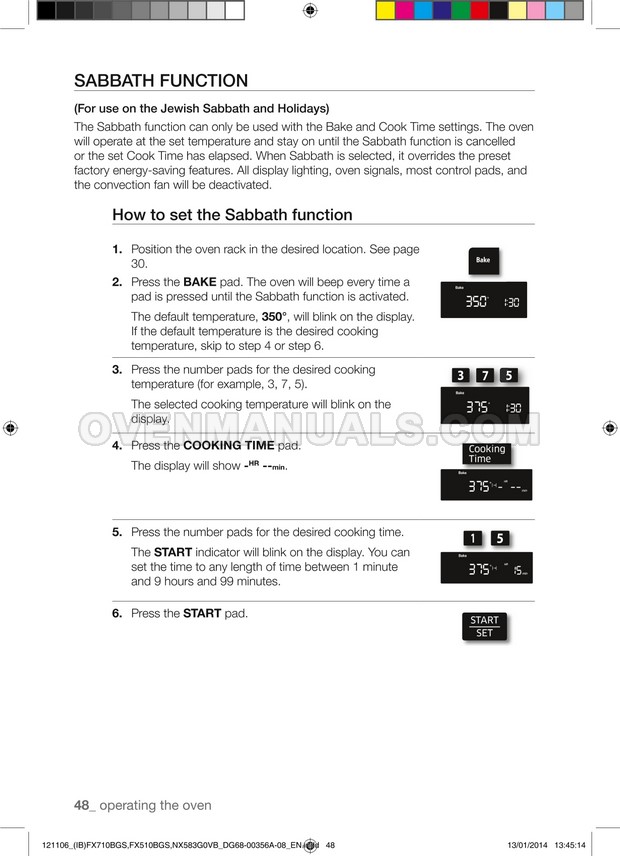 Read the manufacturer's recommendations for cooking with 30 inch freestanding gas range with 5 sealed burners, 5.8 cu.ft. gas convection oven, self-clean, 4 preset menu options, proofing and storage drawer. This 80 page user manual describes all operating modes and features of the Samsung FX510BGS kitchen range.