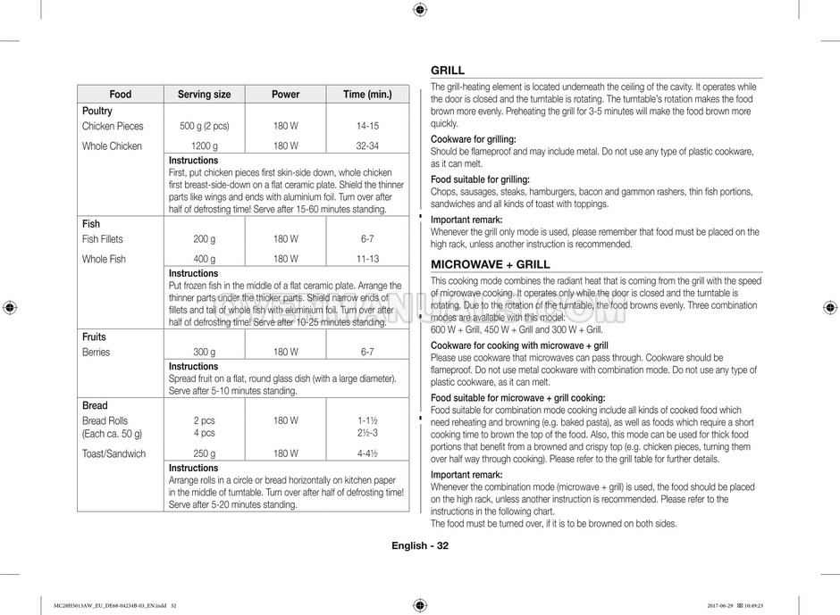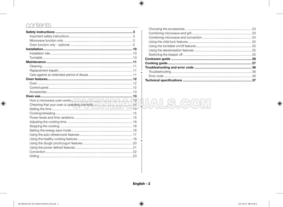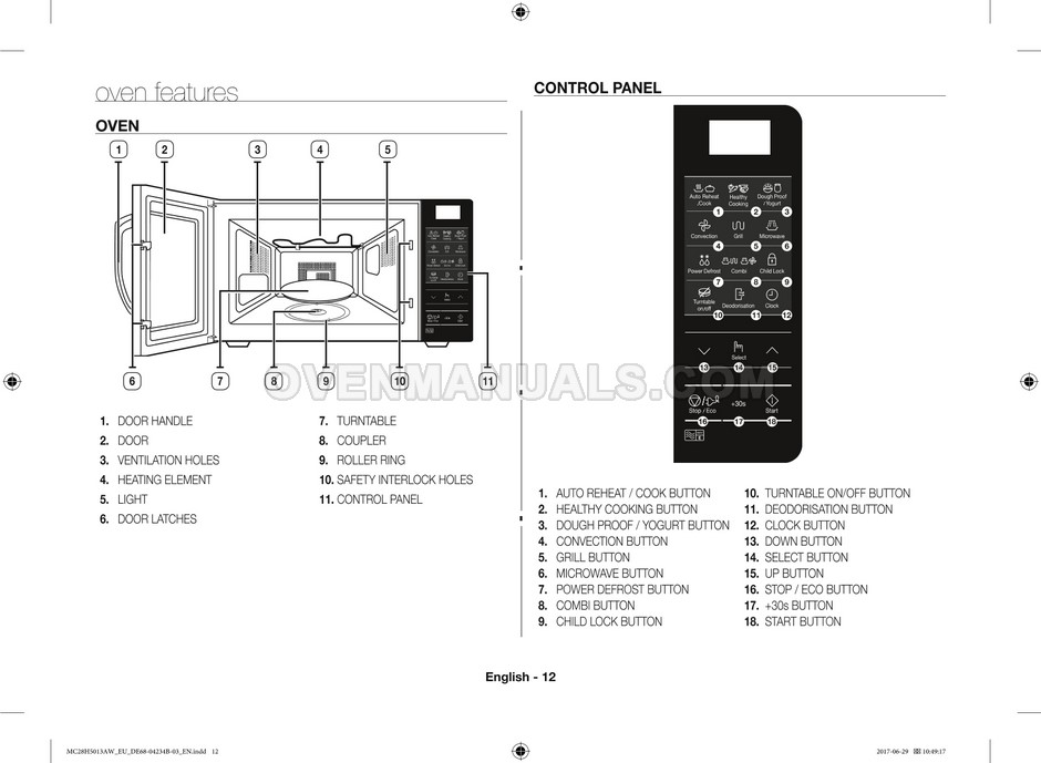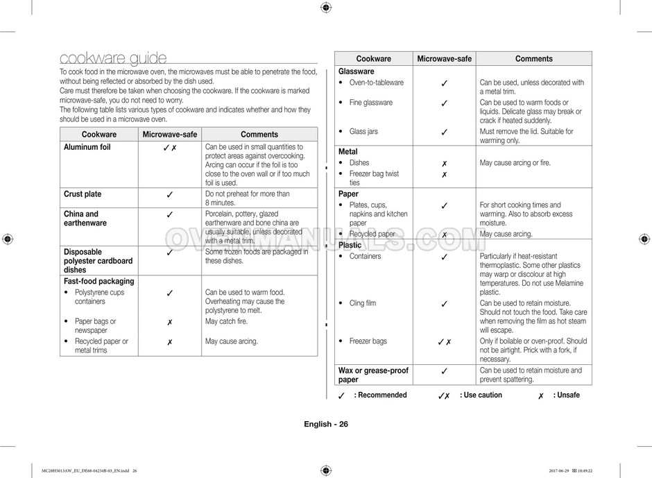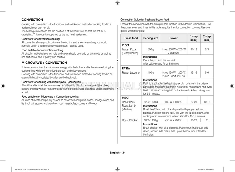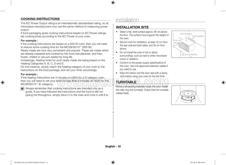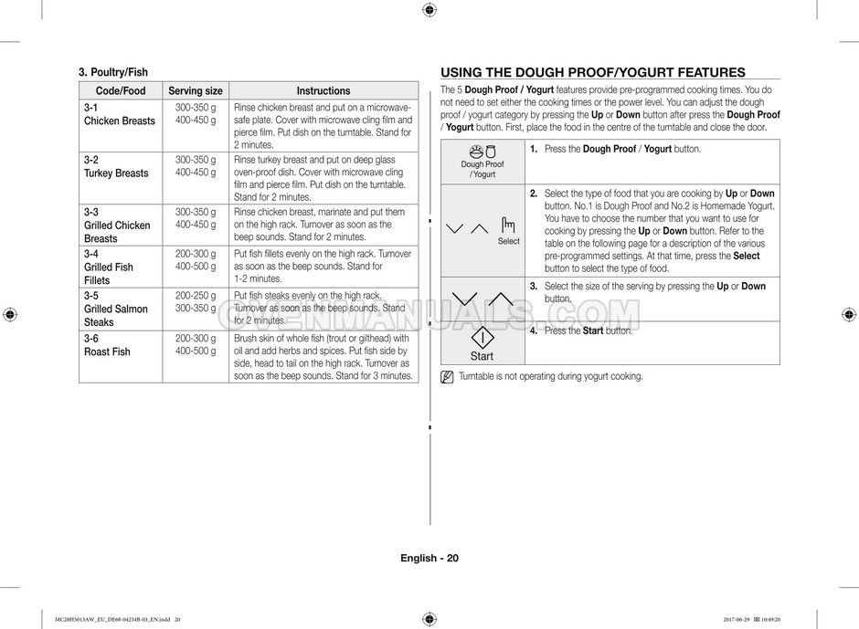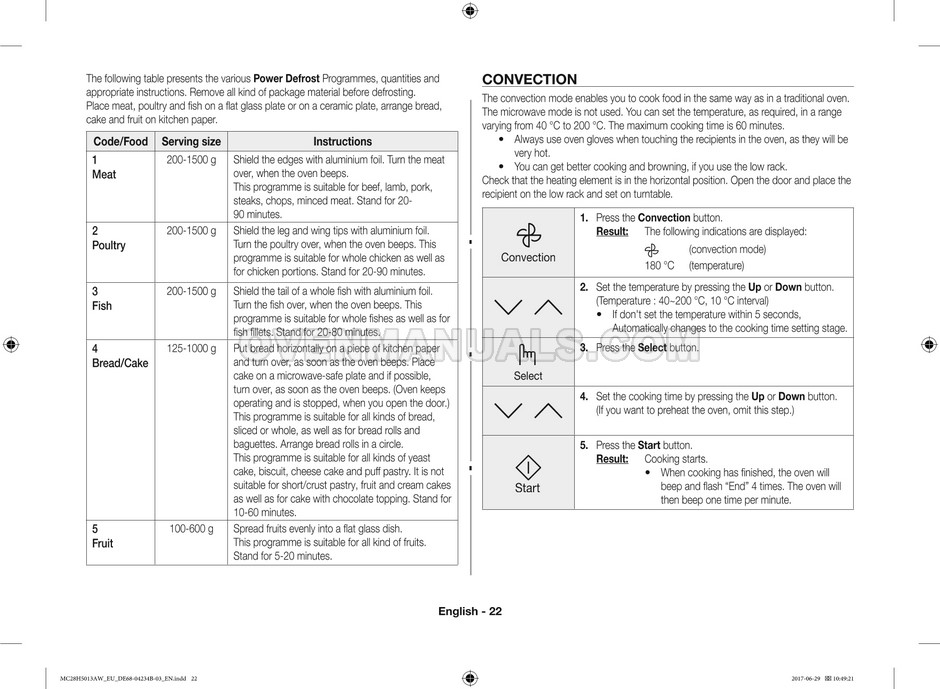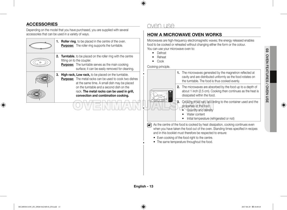 The Samsung MC28H5013AS microwave oven is an essential kitchen tool and contains many features and operating modes for heating and cooking. The manufacturer describes recommendations for setting up and maintaining 28l Ceramic Enamel interior convection smart MWO with fermentation technology dough proof/yogurt on 38 pages of the instructions & cooking guide.