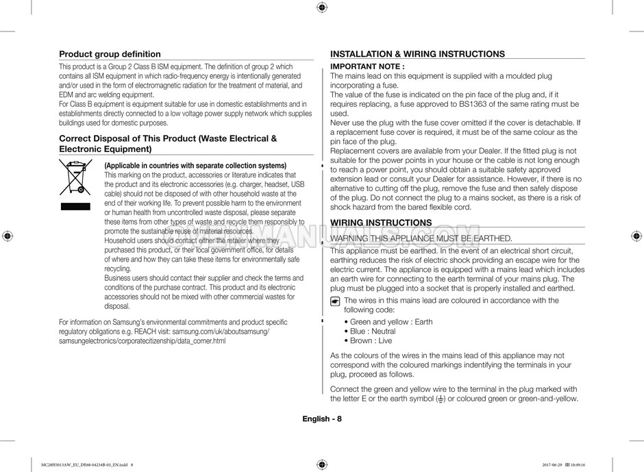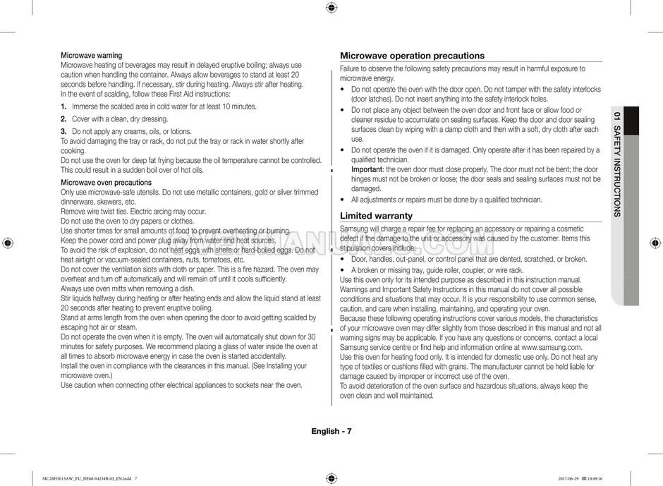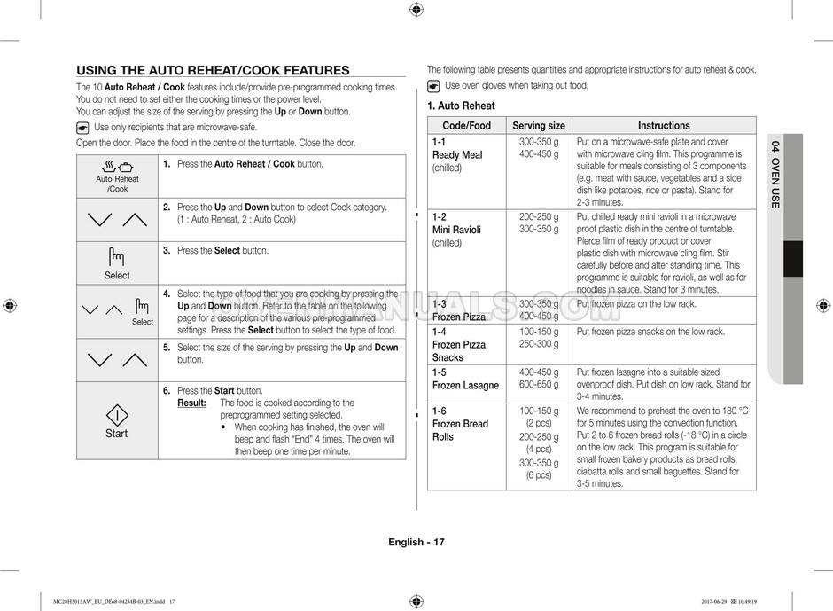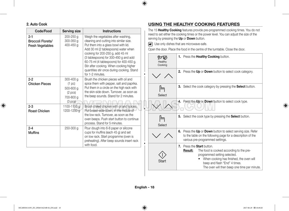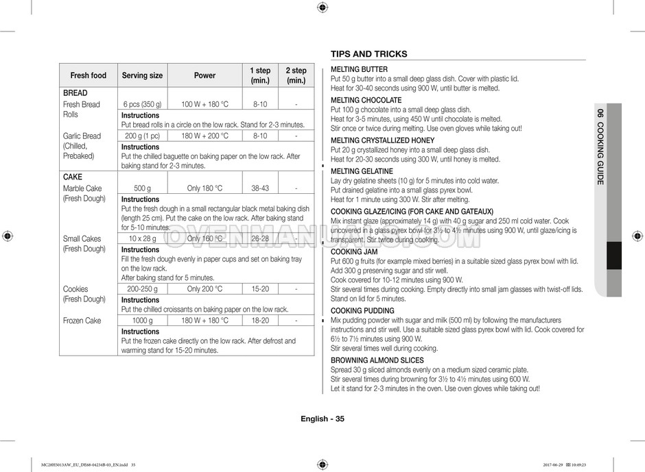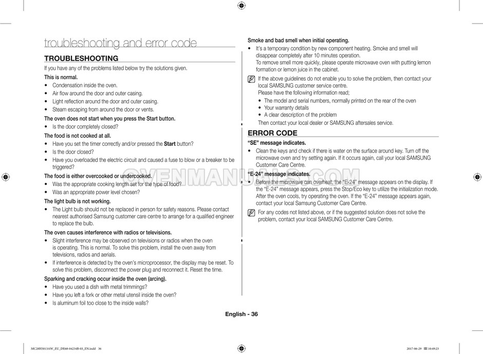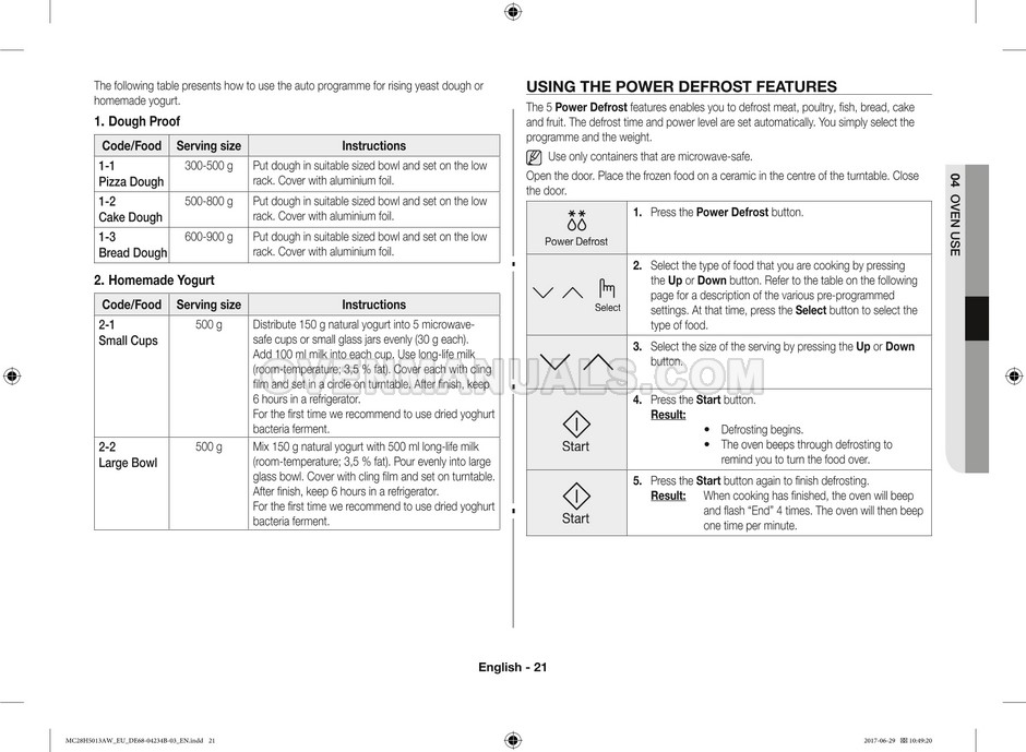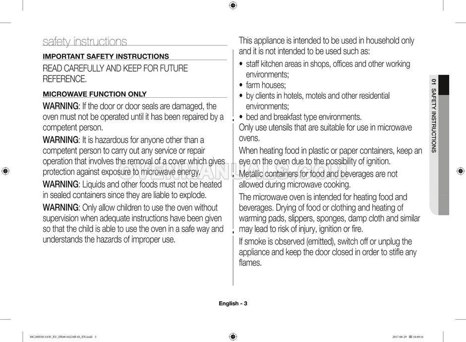 The Samsung MC28H5013AS microwave oven is an essential kitchen tool and contains many features and operating modes for heating and cooking. The manufacturer describes recommendations for setting up and maintaining 28l Ceramic Enamel interior convection smart MWO with fermentation technology dough proof/yogurt on 38 pages of the instructions & cooking guide.