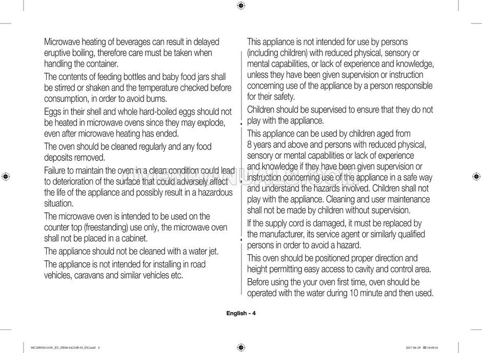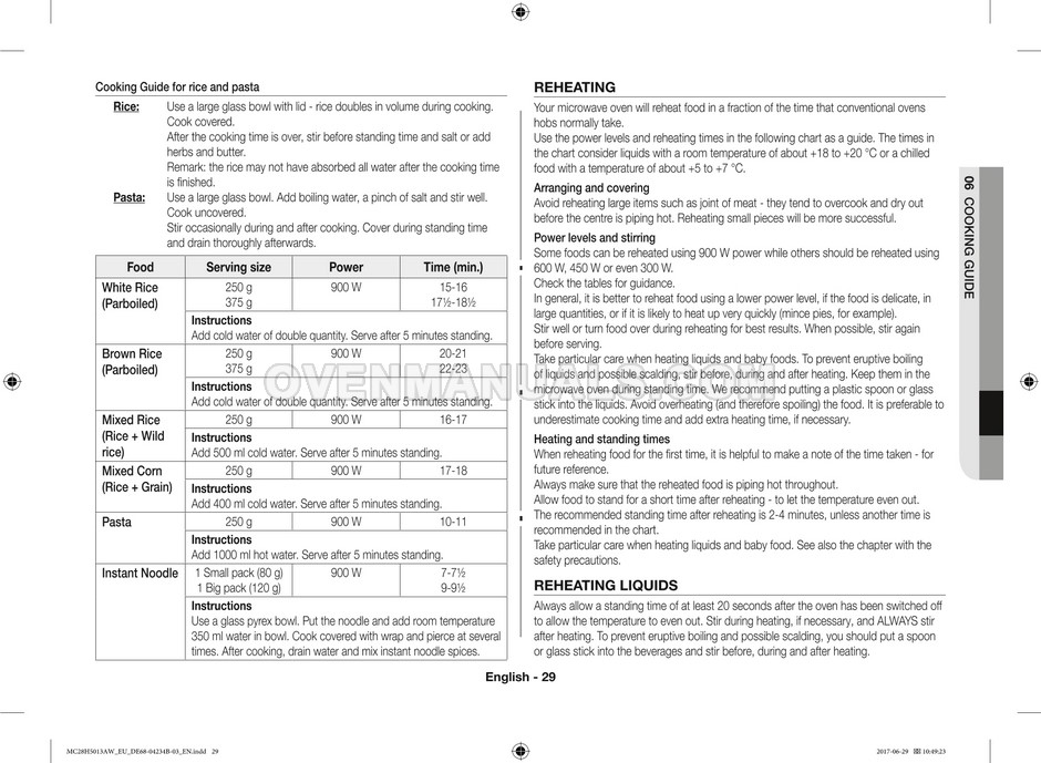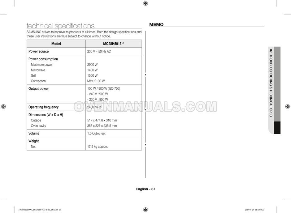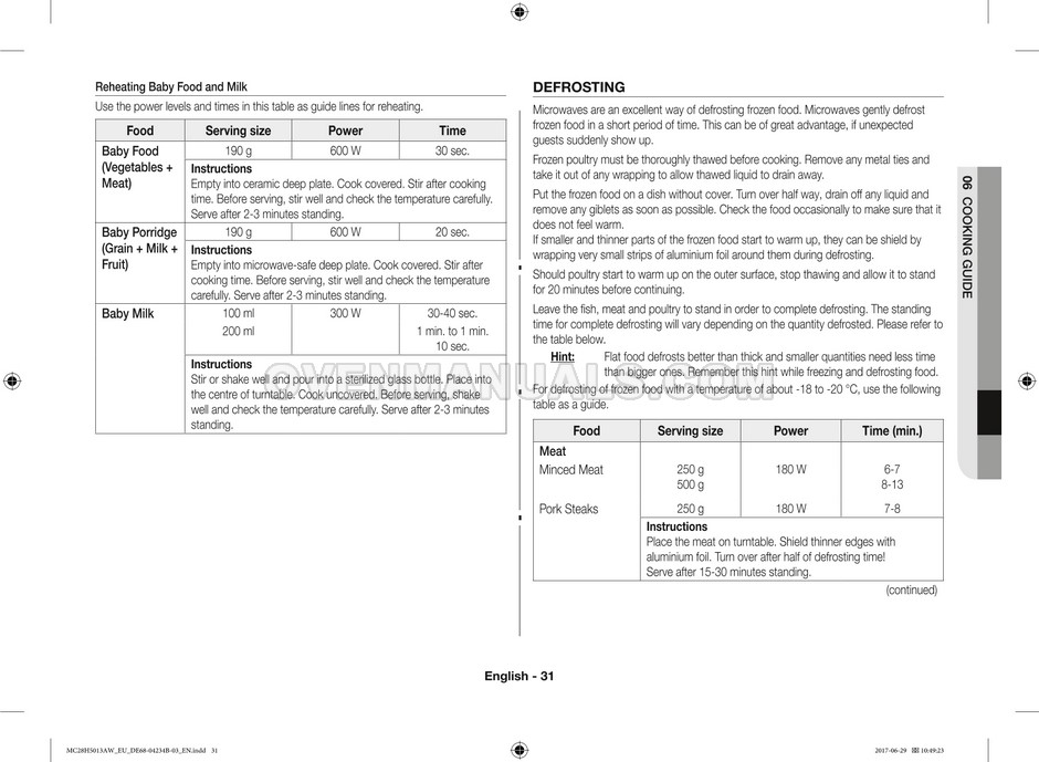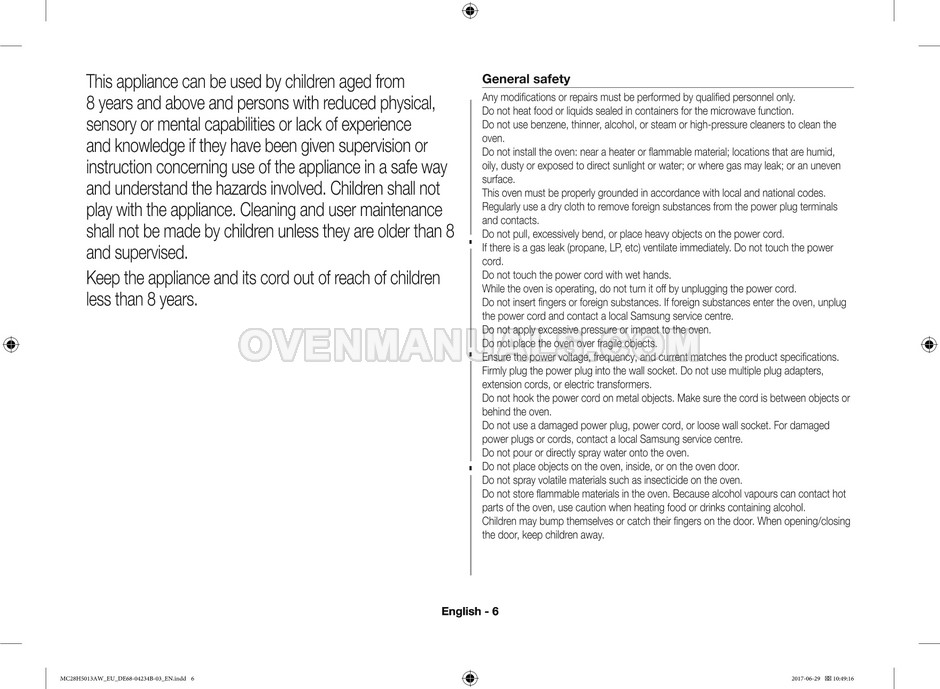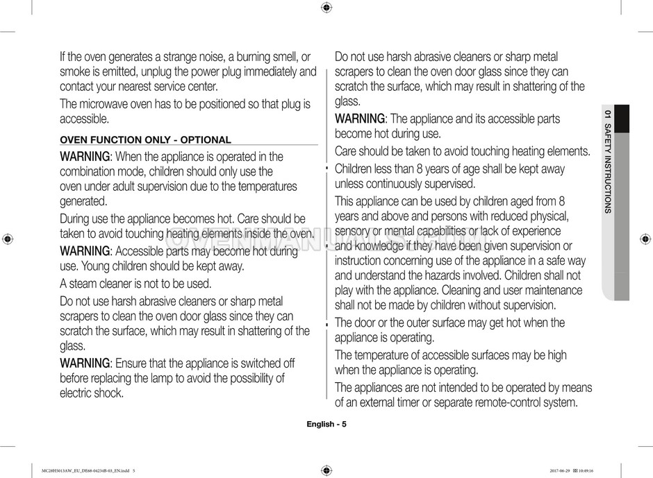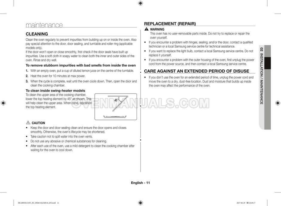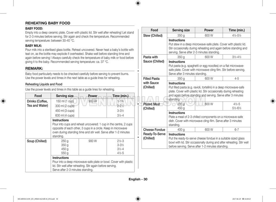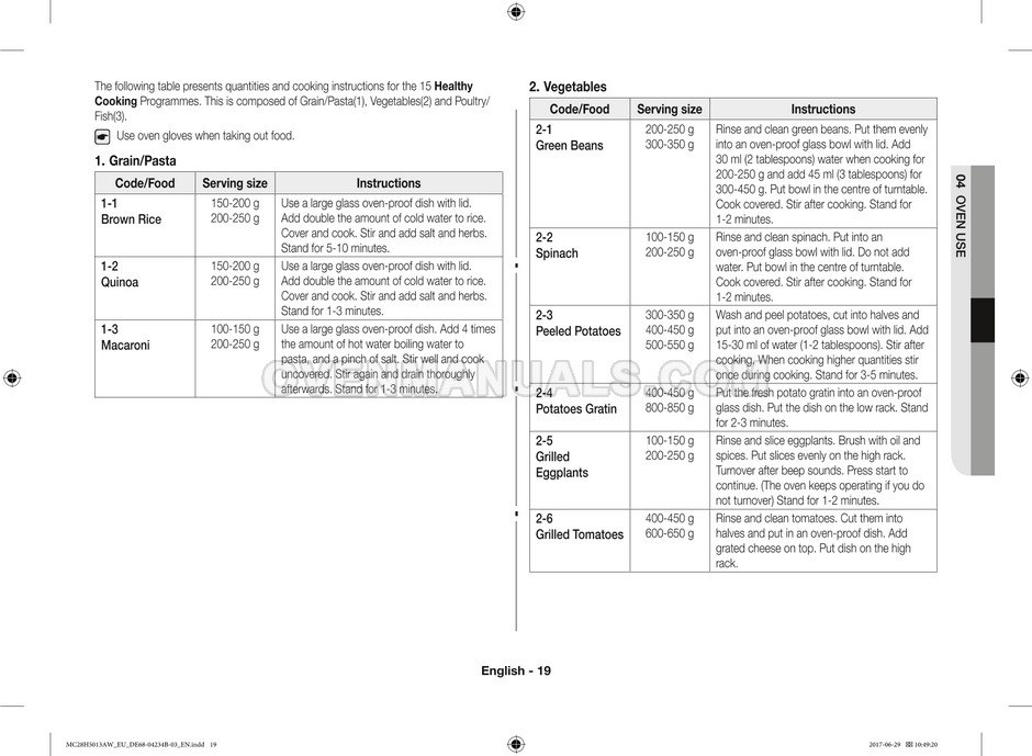 The Samsung MC28H5013AS microwave oven is an essential kitchen tool and contains many features and operating modes for heating and cooking. The manufacturer describes recommendations for setting up and maintaining 28l Ceramic Enamel interior convection smart MWO with fermentation technology dough proof/yogurt on 38 pages of the instructions & cooking guide.