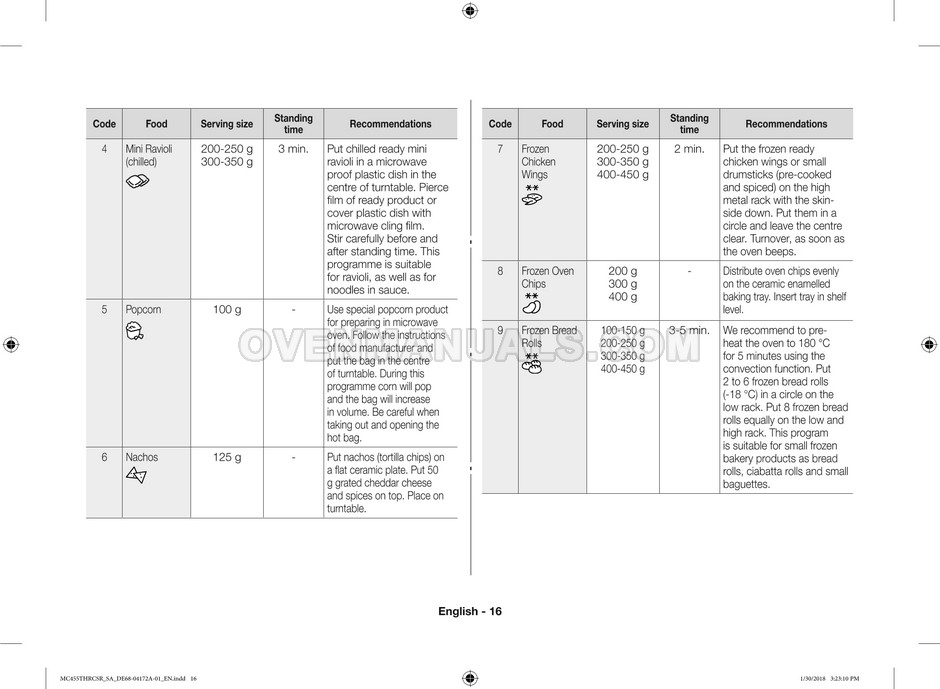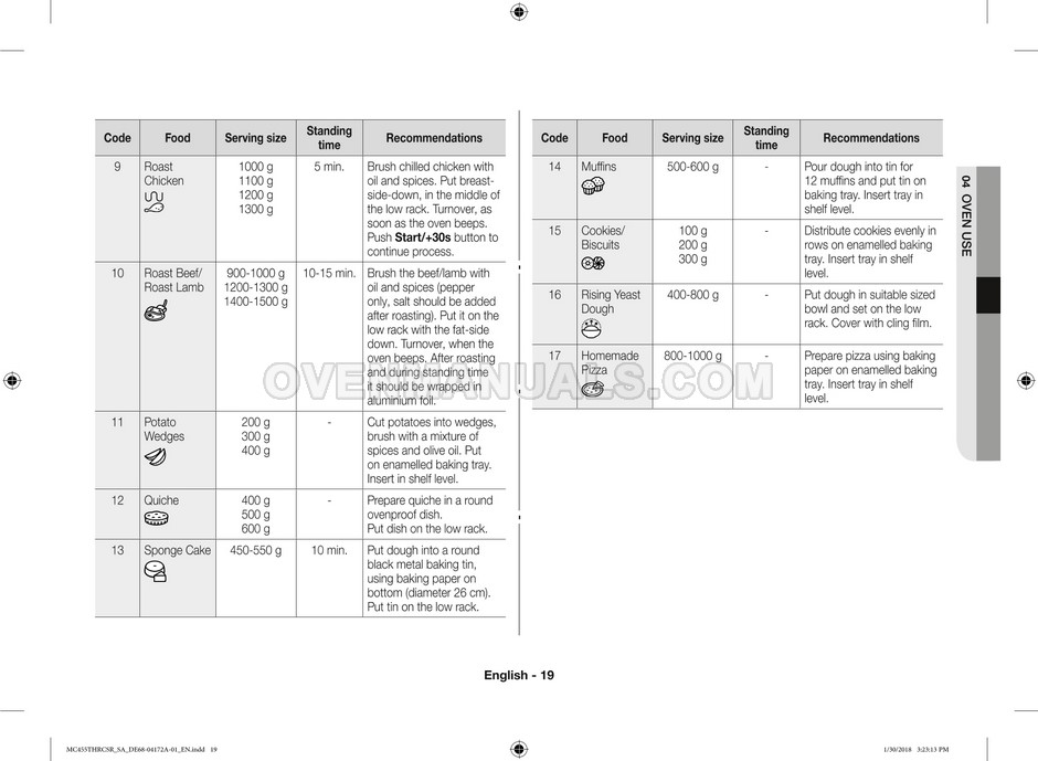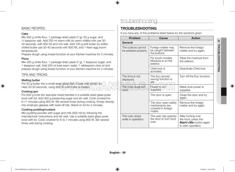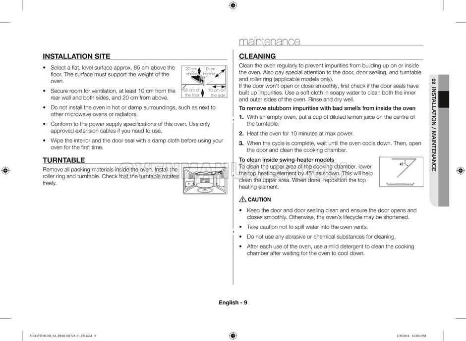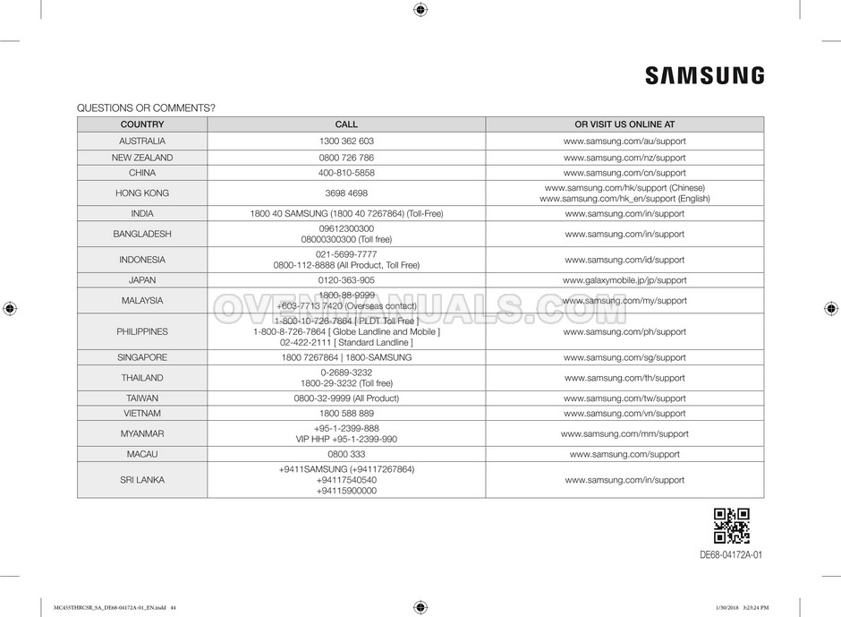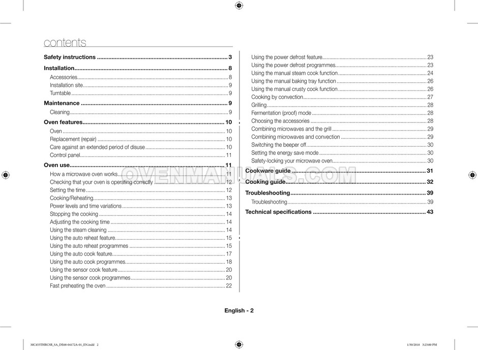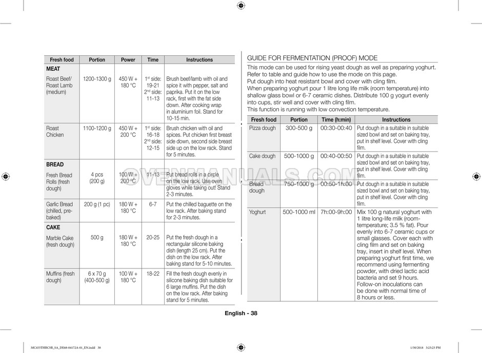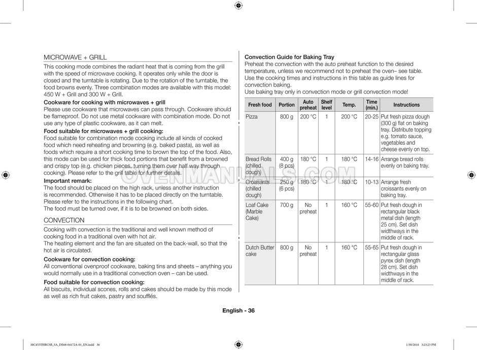 The Samsung MC455THRCBB microwave oven is an essential kitchen tool and contains many features and operating modes for heating and cooking. The manufacturer describes recommendations for setting up and maintaining 45l convection microwave oven with Easy to Clean ceramic, six different cooking modes including Fermentation Mode on 44 pages of the owner's instructions & cooking guide.