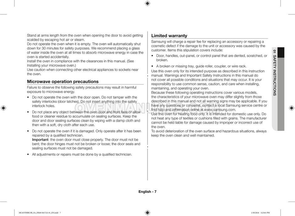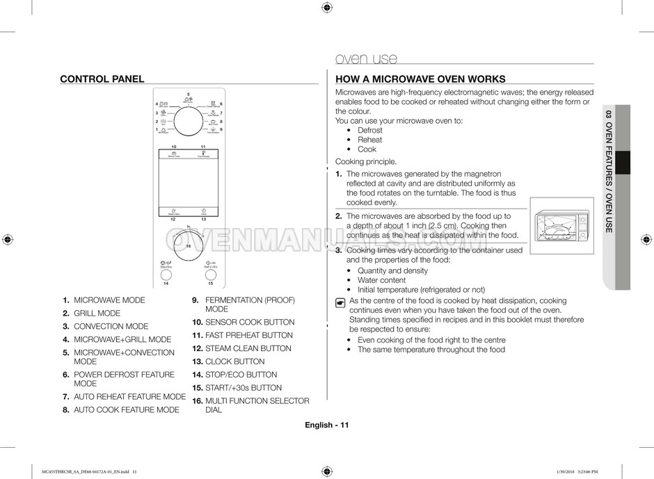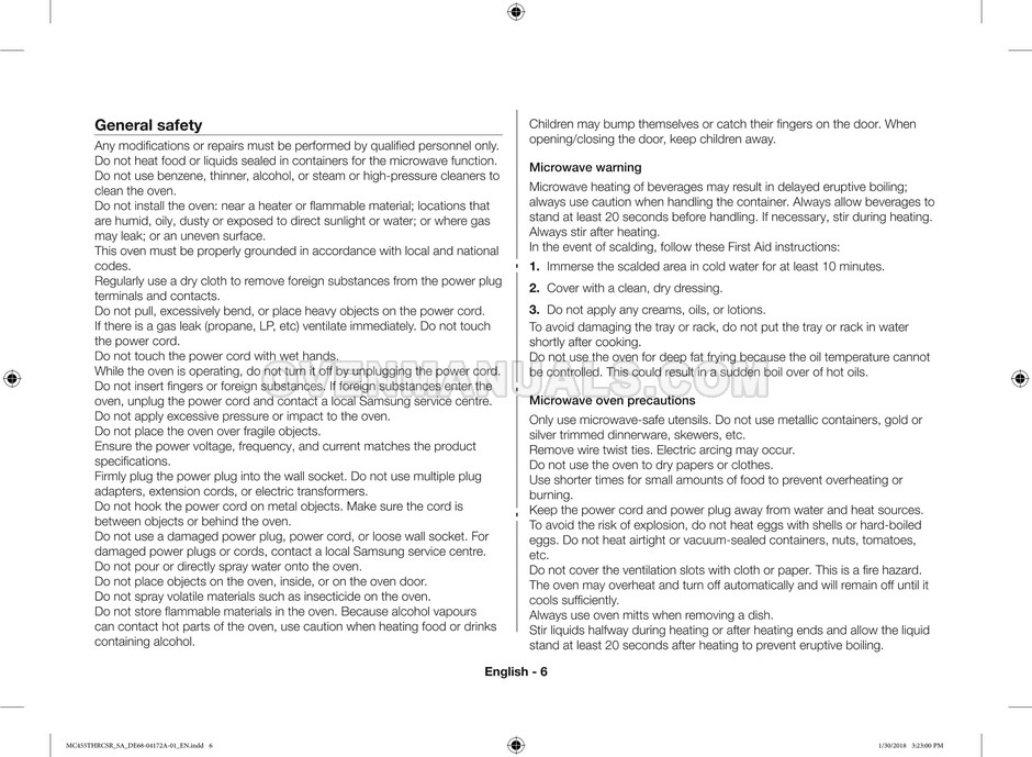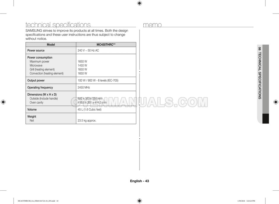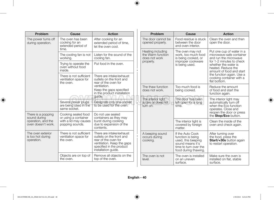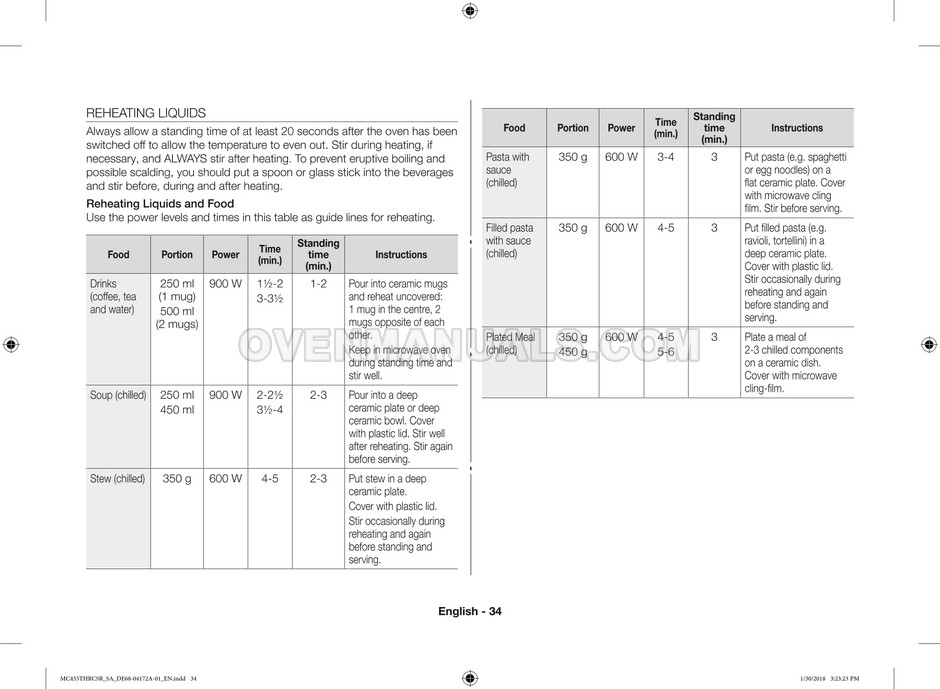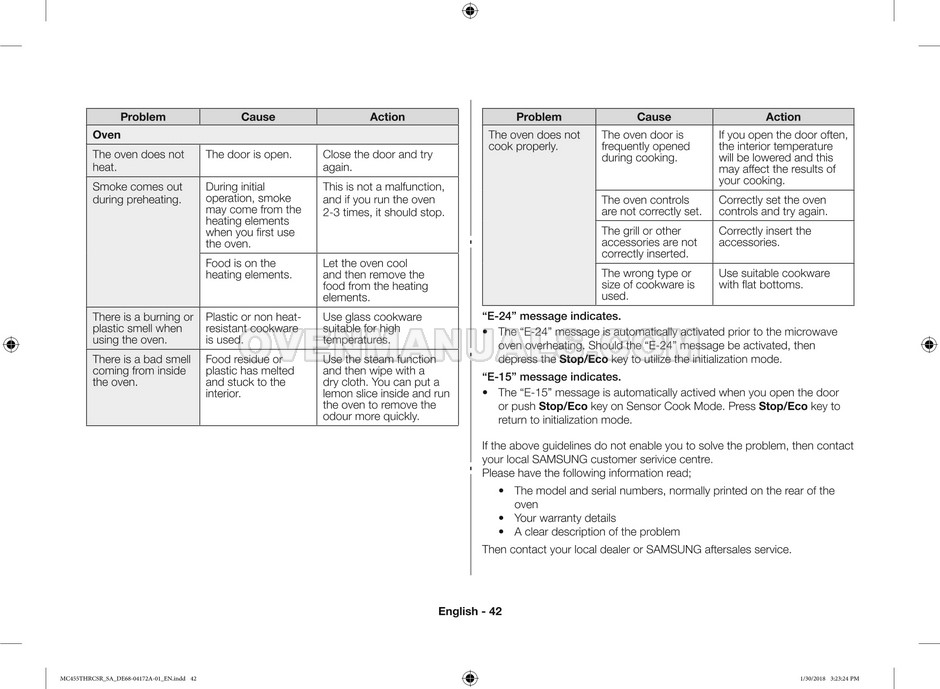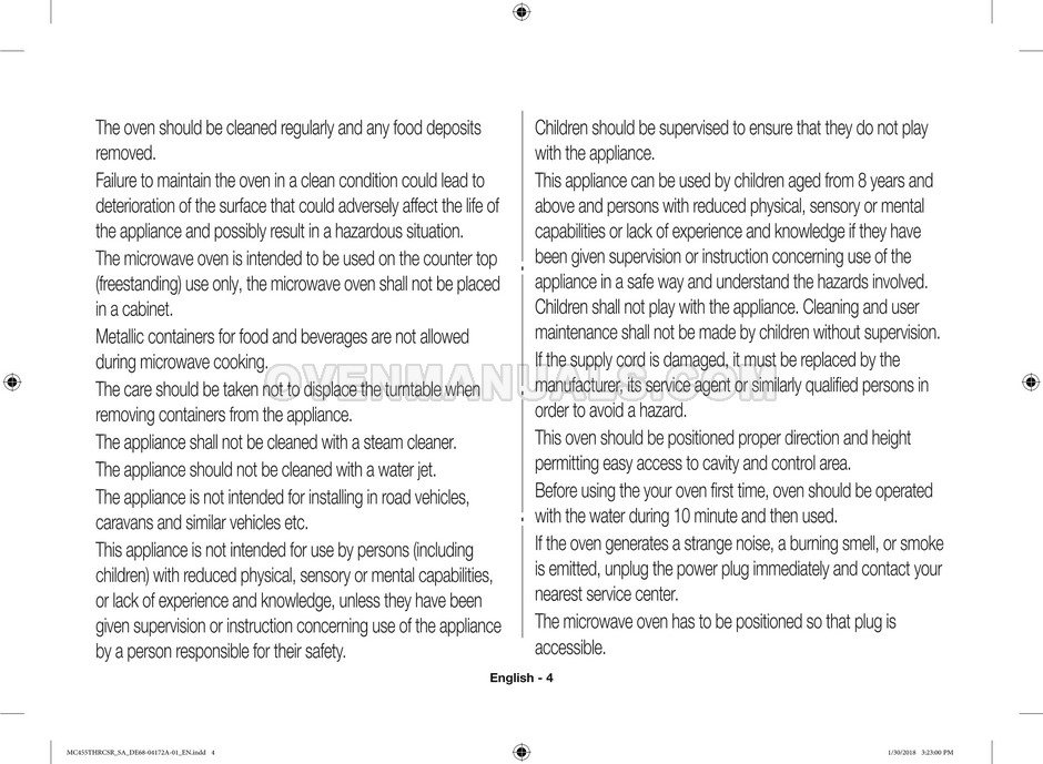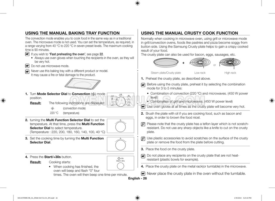 The Samsung MC455THRCBB microwave oven is an essential kitchen tool and contains many features and operating modes for heating and cooking. The manufacturer describes recommendations for setting up and maintaining 45l convection microwave oven with Easy to Clean ceramic, six different cooking modes including Fermentation Mode on 44 pages of the owner's instructions & cooking guide.