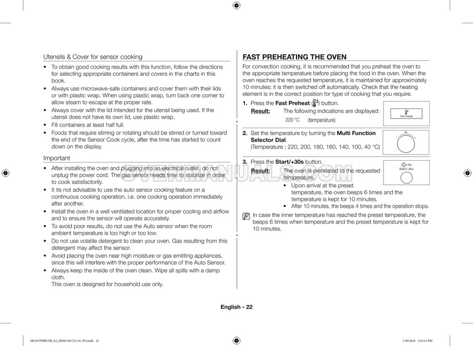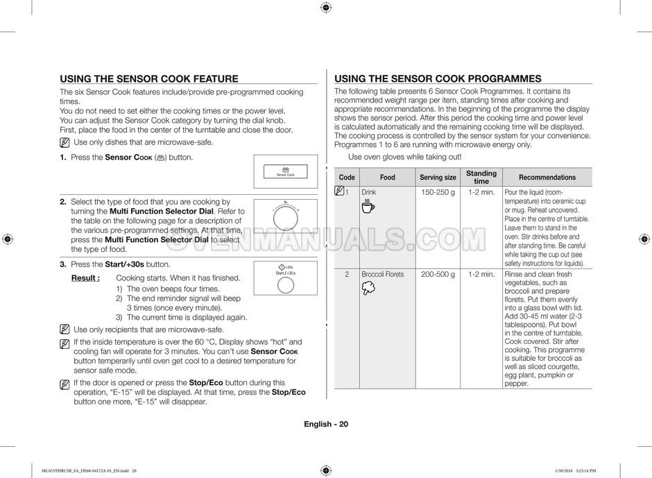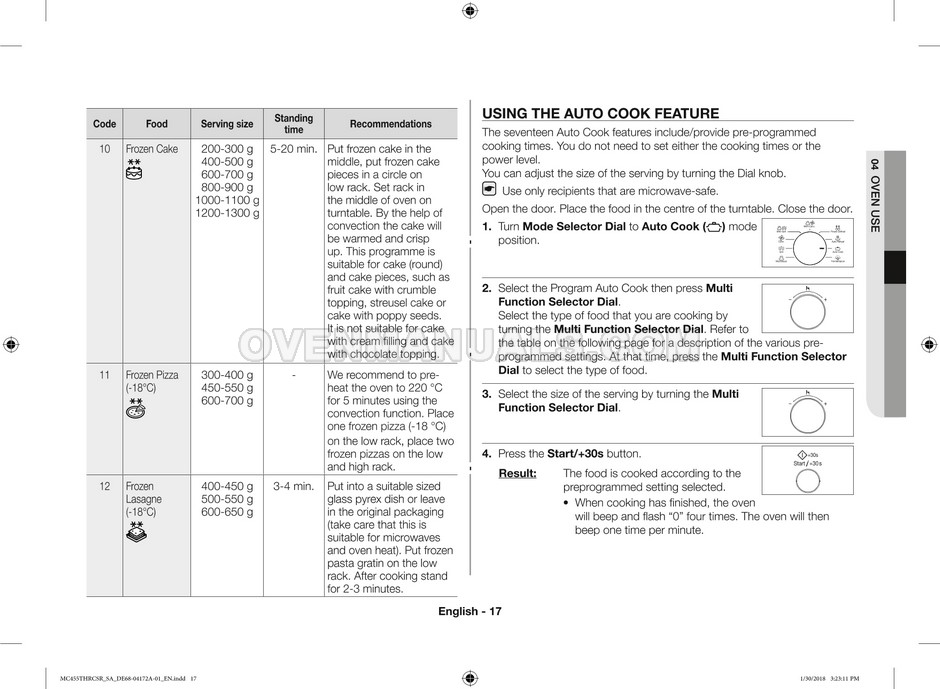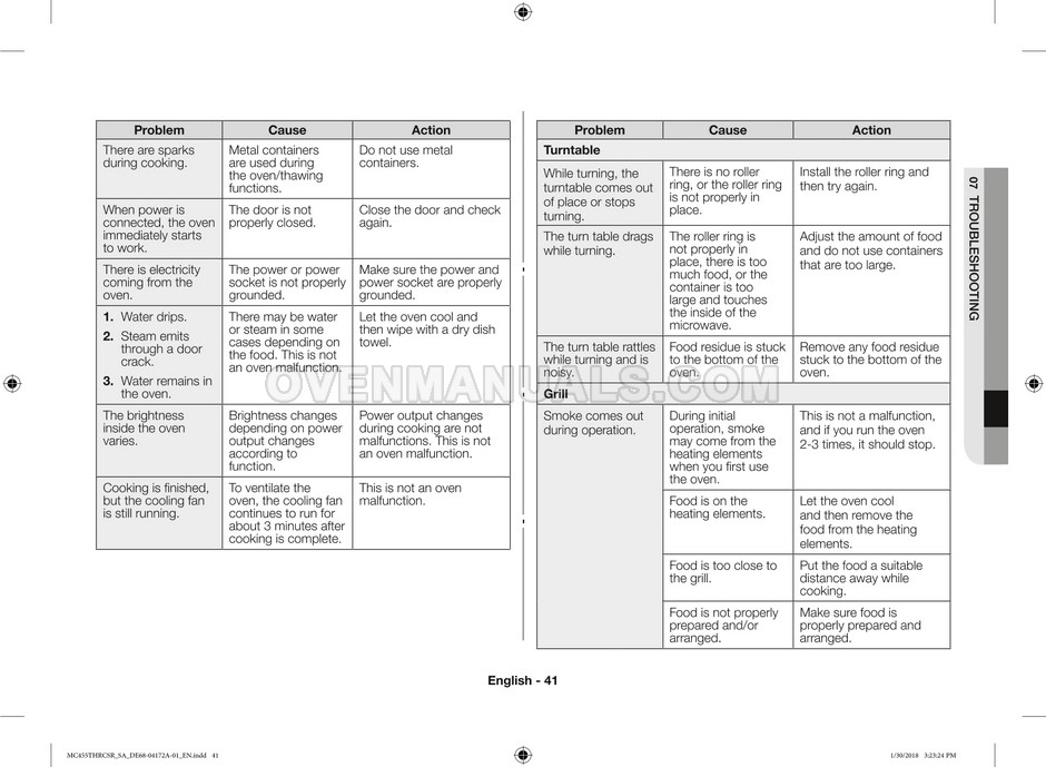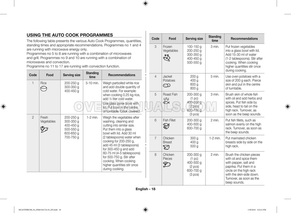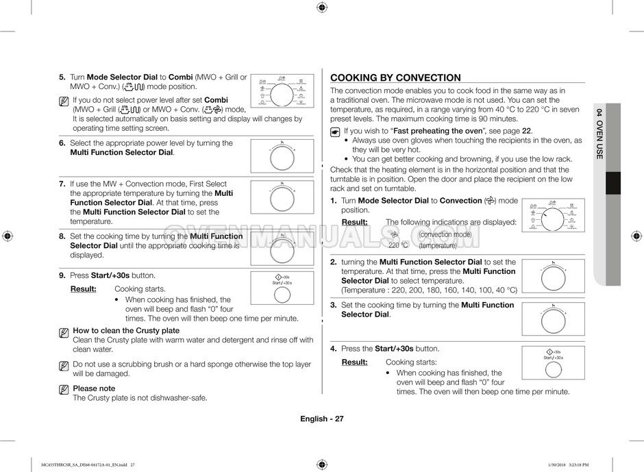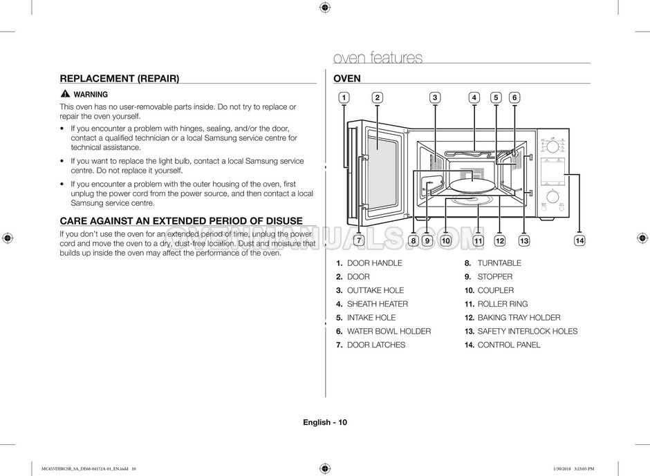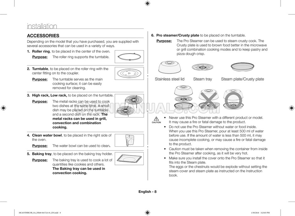 The Samsung MC455THRCBB microwave oven is an essential kitchen tool and contains many features and operating modes for heating and cooking. The manufacturer describes recommendations for setting up and maintaining 45l convection microwave oven with Easy to Clean ceramic, six different cooking modes including Fermentation Mode on 44 pages of the owner's instructions & cooking guide.