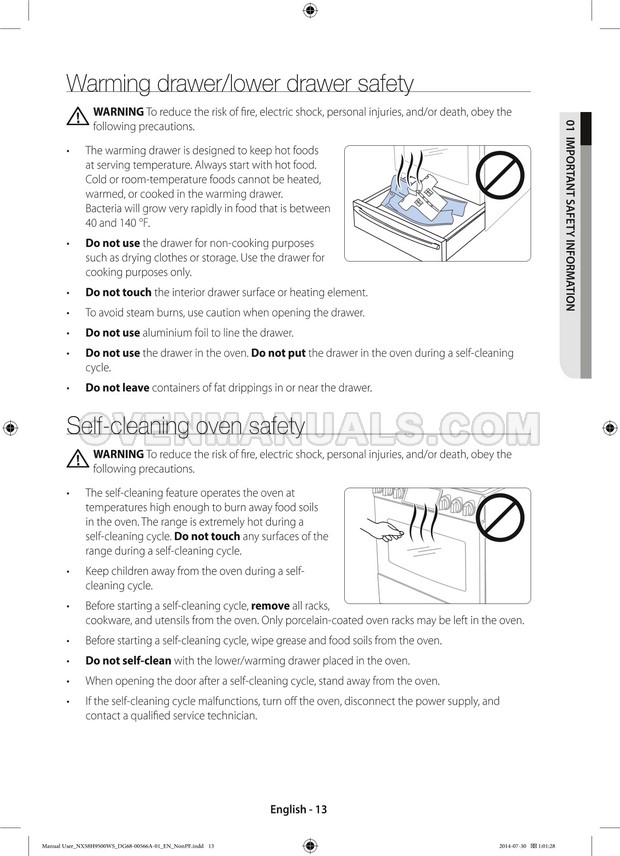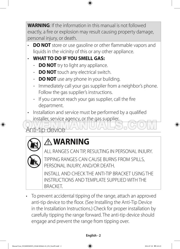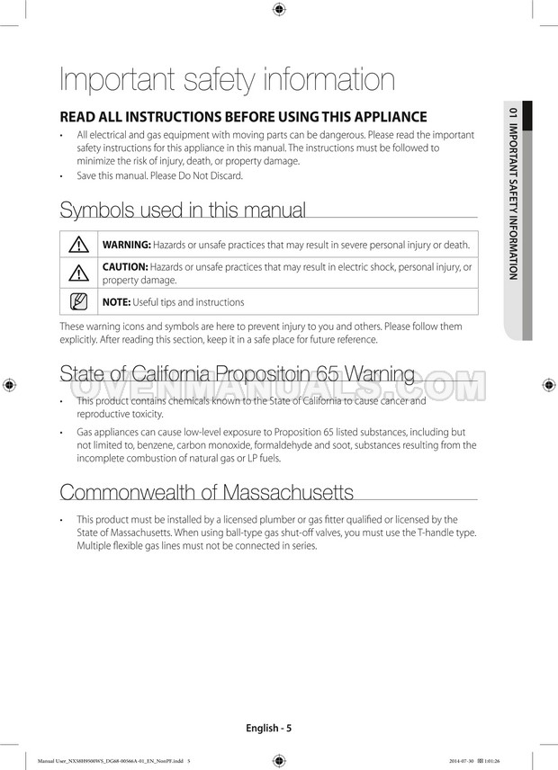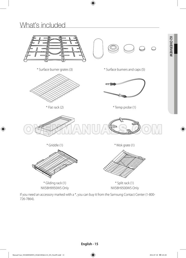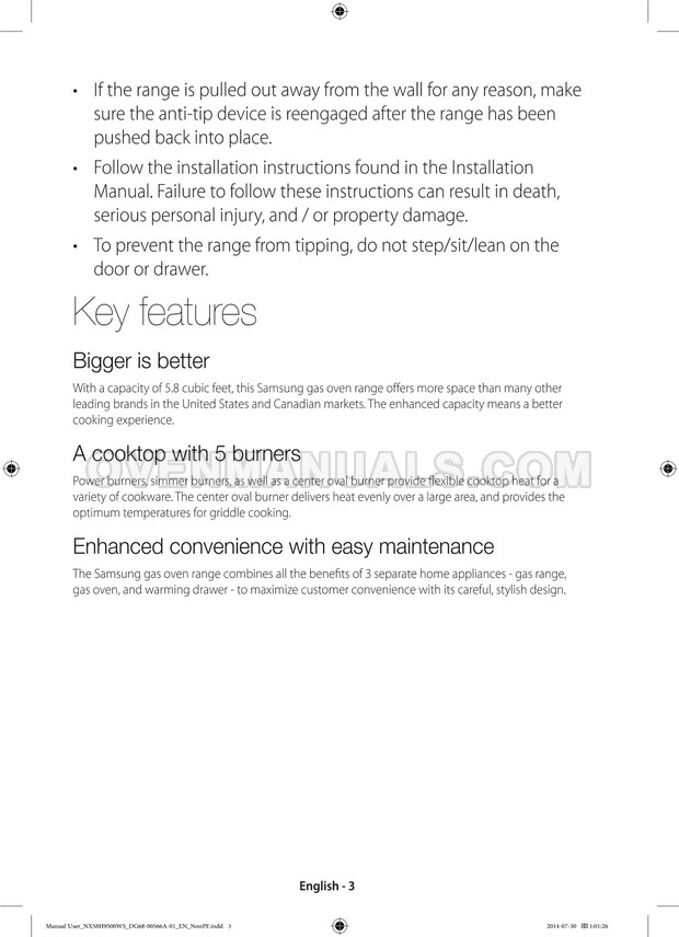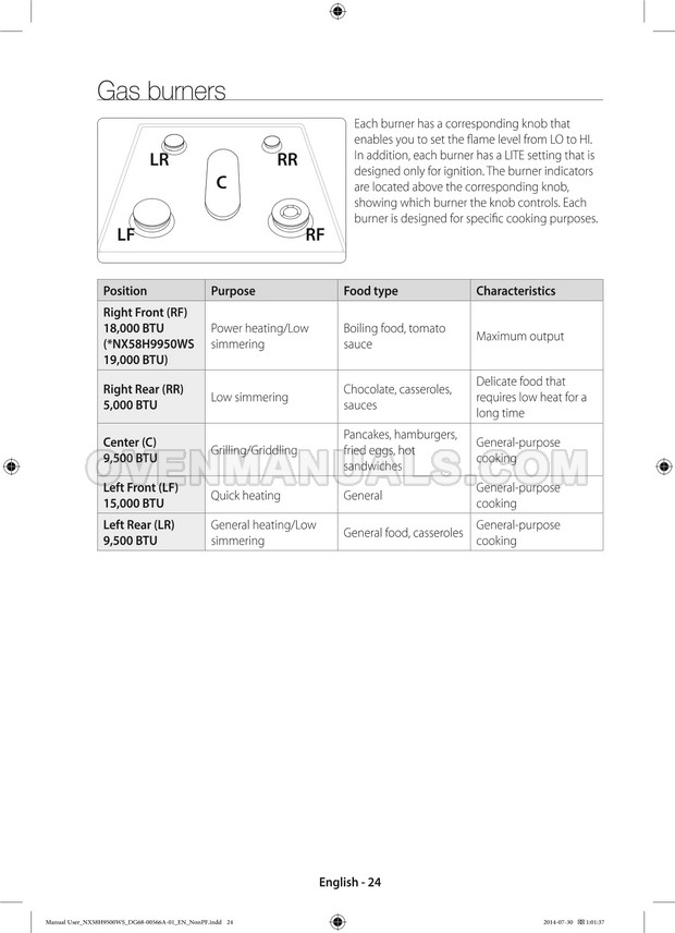 Read the user manual to select the correct mode and set the necessary settings for the (NX58H9950, NX58H9950W) 30 inch slide-in gas range with 5 zones flexible cooktop and 5.8 cu.ft. True Convection oven before starting cooking. This information will allow you to use the Samsung NX58H9950WS range in the kitchen in accordance with the manufacturer's recommendations.
