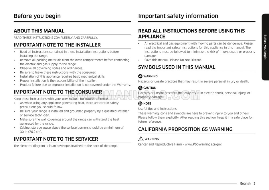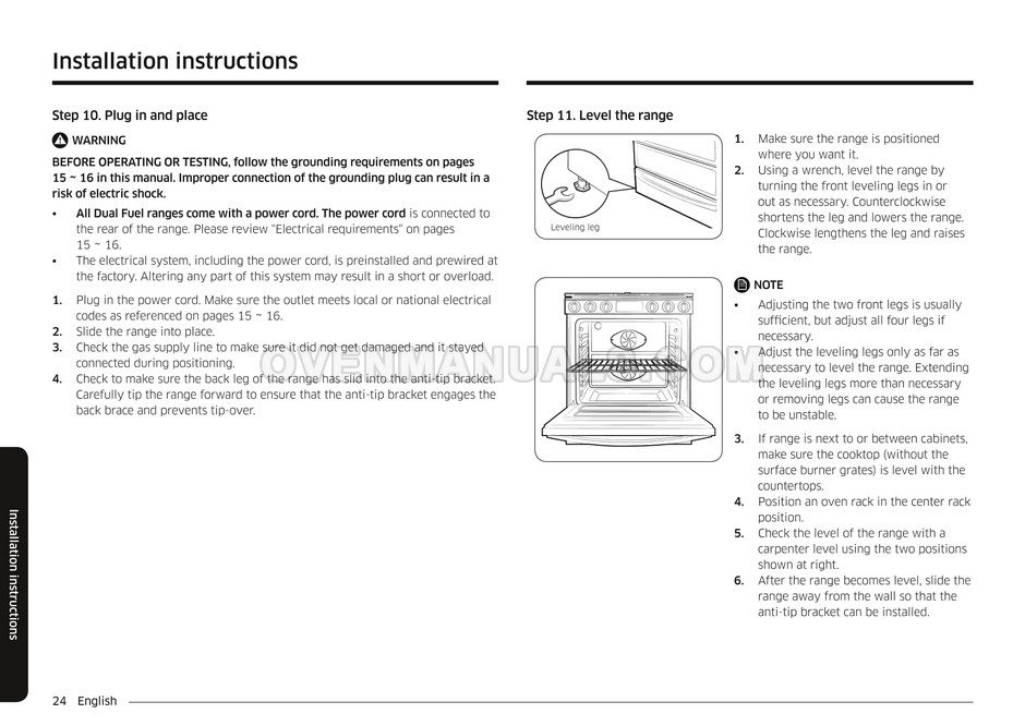 Read the installation manual after purchase to ensure that the Samsung NY58J9850WS range serves for a long time without breakdowns. This document contains all the necessary information for the correct installation and connection of a 5.8 cu.ft. slide-in gas range with Dual Fuel technology, 22k BTU brass burner and dual door.