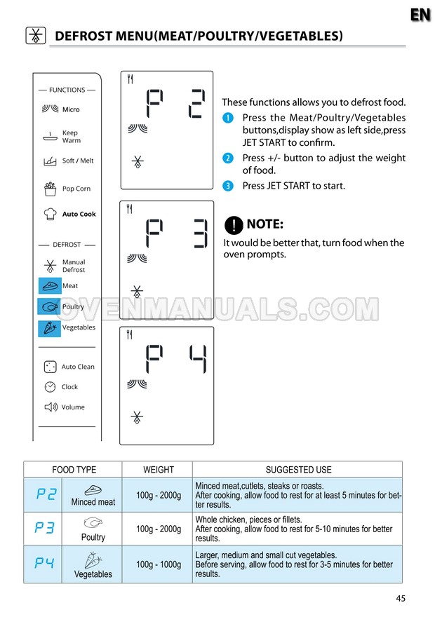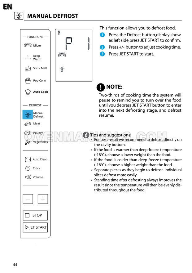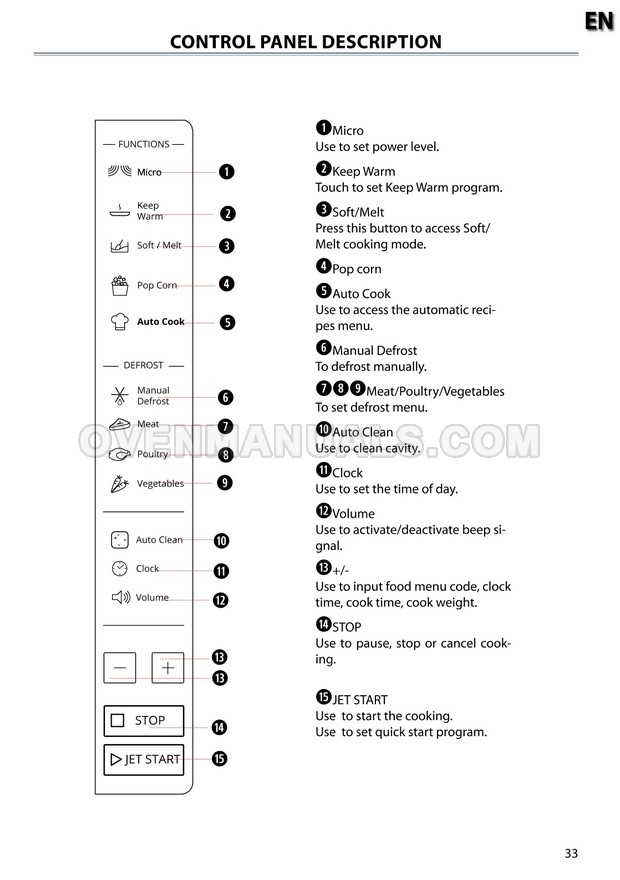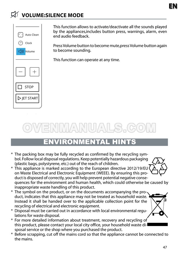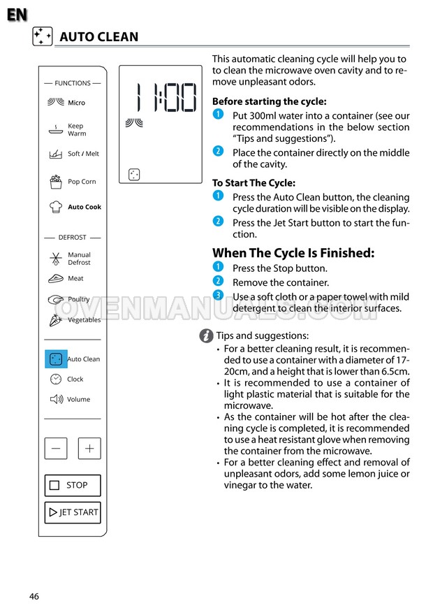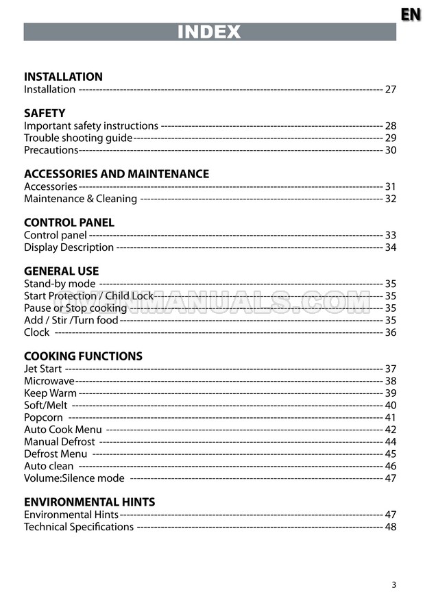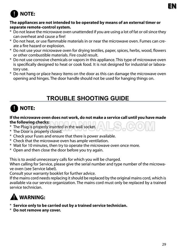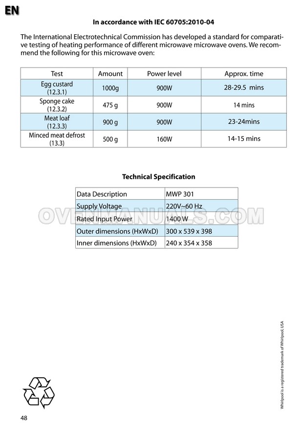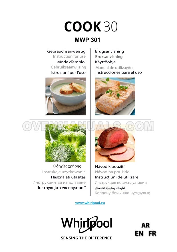 The Whirlpool MWP 301 Cook 30 microwave oven is an essential kitchen tool and contains many features and operating modes for heating and cooking. The manufacturer describes recommendations for setting up and maintaining 30l 900W freestanding microwave oven with child lock, AutoCook and keep warm function on 22 pages of the instruction for use.