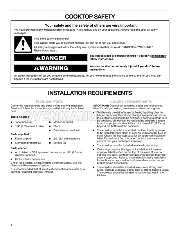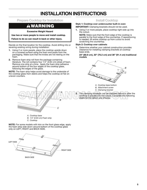 Read this manual if you are going to use the Whirlpool WCE55US6HB hob in the kitchen for a first time. The installation instructions contains the manufacturer's recommendations for connecting and operating a 36 inch electric cooktop with 5 burners, FlexHeat dual radiant element, warm zone, dishwasher-safe knobs.