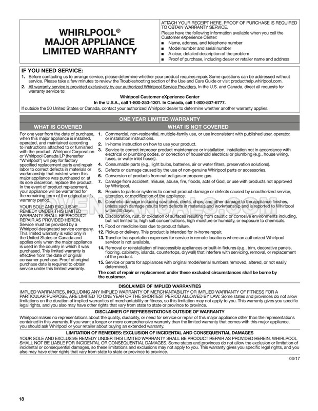 Whirlpool WFE505W0JZ User Instructions